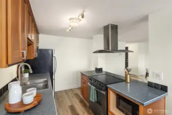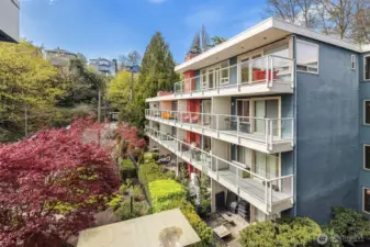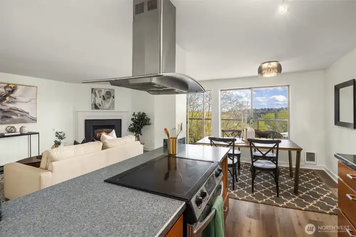 Bright corner retreat with partial Lake Union views! This peaceful 4th-floor unit offers rare serenity with no one above. Nestled beside Trolley Hill Park, it features a stylish designer kitchen with updated flooring, shaker cabinets, and stainless steel appliances. A spacious balcony extends the living space, while the primary and second bedrooms sit near a full bath. Enjoy convenience with secure parking, in-unit laundry, and generous storage. Ideally located in Queen Anne with a well-run HOA—just minutes to Seattle Center, SLU, the Gates Foundation, local dining, coffee spots, and quick access to Highway 99. A quiet, urban escape with no upstairs neighbors!