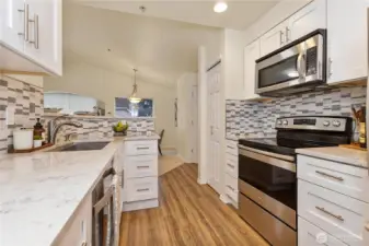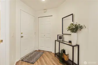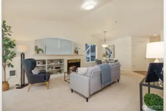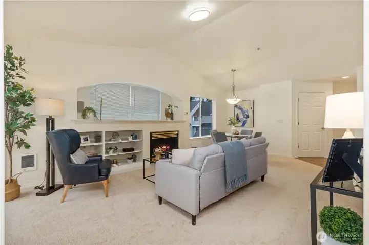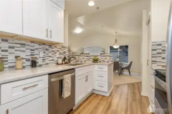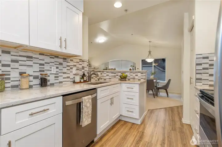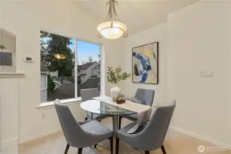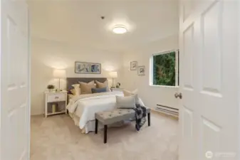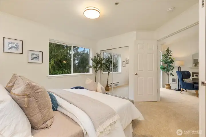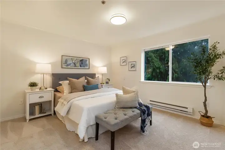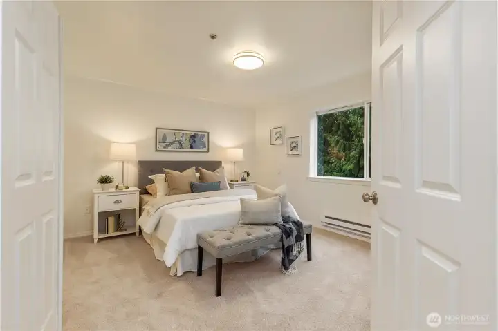 Beautifully updated top-floor end unit with a private garage and two true primary bedrooms. Enjoy no neighbors above and abundant south-facing windows that flood the home with natural light. Vaulted ceilings and extra windows create a bright, open, and airy feel throughout. The home is exceptionally clean and move-in ready with new carpet, fresh interior paint, LVP flooring, modern LED lighting, and built-in surround sound speakers perfect for relaxing or entertaining. The updated gourmet kitchen features quartz countertops and newer stainless steel appliances. Primary bedroom one includes a walk-in closet and full bath, while primary bedroom two opens through French doors and offers a walk-in closet and step-in shower. Unwind after a long day or BBQ on your private deck overlooking a peaceful pond, complete with the soothing sights and sounds of swimming ducks. Park in your oversized garage with extra storage. Excellent location with easy access to Boeing, I 5, Highway 99, and 405. Close to Trader Joe’s, Dick’s Drive In, Costco, and Everett Mall. Pet friendly HOA.