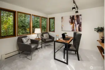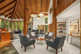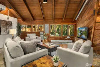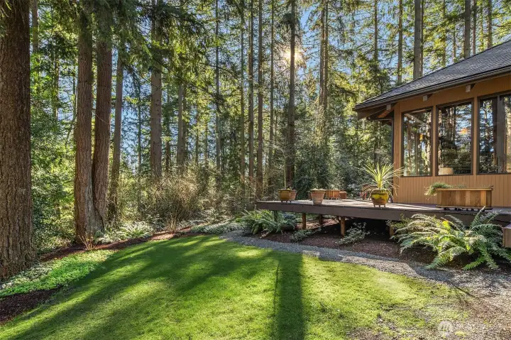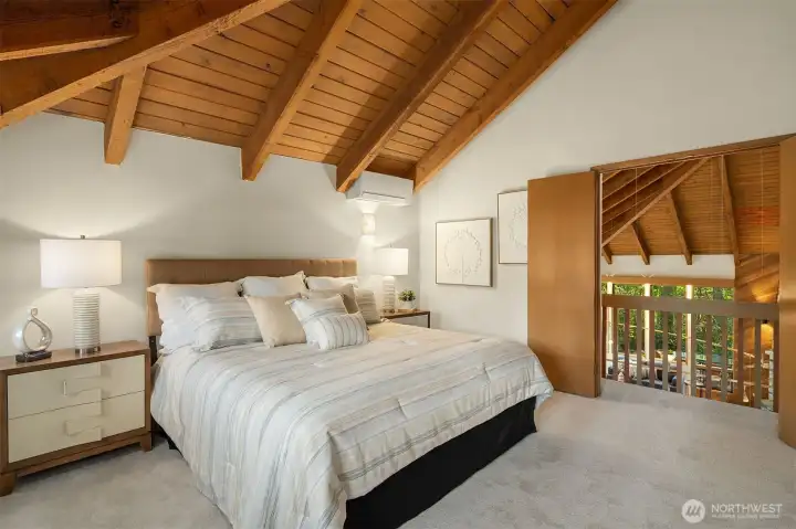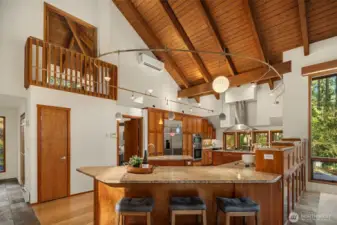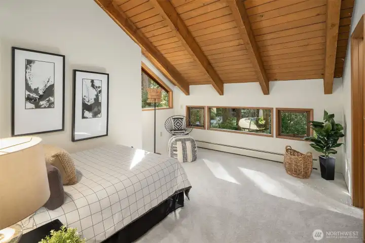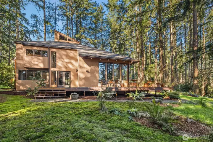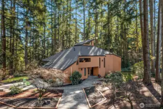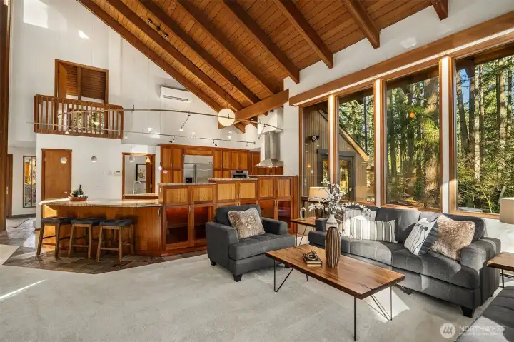 Tucked away on a serene 1.1-acre, park-like setting, this custom Northwest contemporary blends striking architectural design with exceptional livability. The open-concept main floor features soaring wood ceilings & expansive windows that frame the surrounding natural beauty. A slate tile entry leads into the dramatic great room, anchored by a floor-to-ceiling stone fireplace & complemented by built-in display cabinets & a formal dining area with French doors to an expansive deck—ideal for indoor/outdoor entertaining. The remodeled chef’s kitchen opens to the great room & showcases slab granite counters, bamboo floors, island with prep sink, cherry cabinetry with pull-out shelving, stylish pendant lighting, stainless appliances & a casual dining area with skylight, planning desk & French doors to the deck. The main level offers flexibility with a den, spacious primary suite featuring a full bath & dual closets, & a bonus room with bamboo & tile floors, loft & ¾ bath. Upstairs are 3 additional bedrooms including a 2nd primary suite with updated spa-inspired bath featuring heated floors, a tile & stone shower, soaking tub, dual-sink vanity & walk-in closet. Prime location on a non-through street just steps to Bridle Trails Park with over 480 acres & 28 miles of recreational trails. A 3-car carport with storage & EV charger, ample off-street parking, and new gas generator & mini-splits in 2025 add comfort & convenience to this peaceful retreat. New roof, interior paint & carpet.