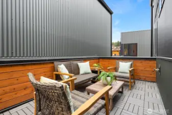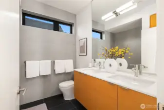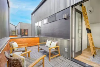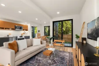 Modern luxury meets sustainable living in this 5-Star Built Green home, ideal for an intentional lifestyle. Tucked in nature yet blocks to downtown, this urban oasis blends tranquility w/ convenience. Walk to eateries, shops, galleries & cafes, or enjoy a serene ferry ride—car-free living made easy. The home pairs calm w/ contemporary design: sleek wood finishes, hdwd floors, vaulted ceilings, expansive windows & a rooftop deck. Community gardens, bonfire pit & nearby trails foster connection & a sense of belonging. Efficient, healthy systems, EV-ready parking & solar-ready features support modern living. Close to parks & top-rated schools. Own your Bainbridge retreat—use seasonally, rent ST, or live yr-round. Flexible ownership to match your lifestyle.