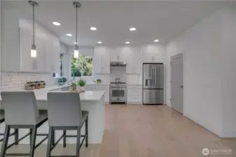Larger than most homes, this luxurious newly built 2-story Penthouse boasts 2,620 sf, 4Br/3.25Bth, and a massive rooftop deck with sweeping Lake Union, Ship Canal, and Cascade views. Light-filled interiors, high ceilings, hardwood floors, and an envious chef’s kitchen with 5-burner Bertazzoni gas range, quartz counters, SS undermount sink, eating bar, and walk-in pantry. Main floor guest bedroom and lavish 3/4 bath with heated floors and extra-large all glass walk-in shower. Primary suite features spa-like 7-piece bath (double sinks, walk-in glass enclosure multi-head rain shower, dreamy separate free standing soaking tub, & private water closet), heated floors, dual walk-in closets and serene vistas. Bow window design outlining views in living room and 2nd bedroom with double closets. Includes EV charger & tandem 2-car parking. Prime Wallingford location near University of Washington, Gas Works Park, Burke Gilman Trail, Fremont, Green Lake, JSIS, Children's Hospital, downtown, South Lake Union, I-5 & Highway 99. Close to dining, shops, & transit. 82 Walkscore and 81 Bikescore!