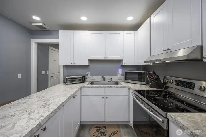 Comfortable kitchen and full bathroom on the first floor of the Shop ADU.