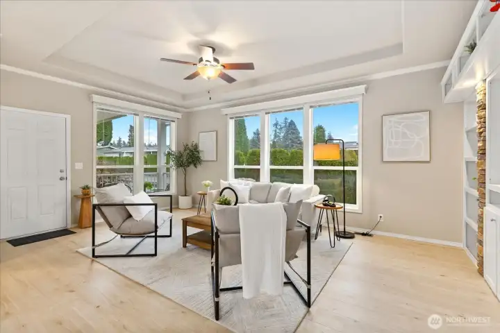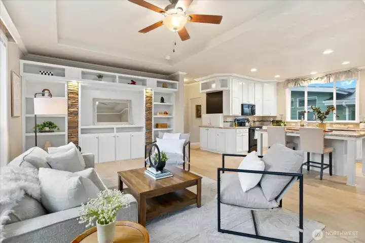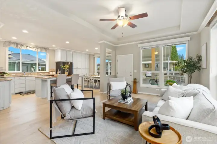 Welcome to Green Acres, a sought-after 55+ community. This charming 3-bed, 2-bath home offers comfortable living with vaulted ceilings, an open floor plan, and abundant natural light. The kitchen features ample cabinetry, pull out shelving, island with eating area as well as room for a dining table. LVP flooring throughout. Community amenities include a clubhouse, walking trails, lakes, dog park, and daily activities. Prime Canyon Park location with easy access to I-405, shopping, dining, and medical.