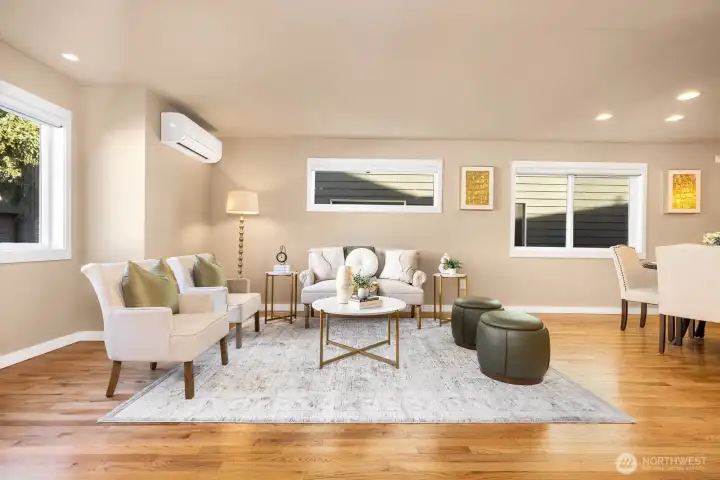 Enjoy unbeatable walkability to vibrant Greenwood and Green Lake, with easy access to Seattle via multiple routes. This spacious, light-filled 3-bedroom, 2.25-bath townhome is exceptionally well maintained and truly move-in ready with tasteful updates throughout. The open main level features granite countertops, stainless steel appliances, a dining area, and a generous living room with fireplace—ideal for entertaining or everyday living. A lower-level bedroom with ensuite offers flexibility for guests or a home office. Upstairs, the oversized primary boasts vaulted ceilings and ample closet space. Mini-splits provide year-round comfort. The fully fenced backyard features low-maintenance turf, a spacious patio, and a matching storage shed. One-car garage and abundant natural light complete this inviting home. This is a must see!