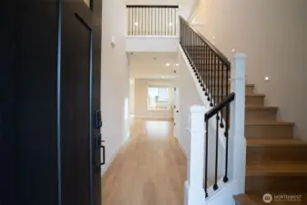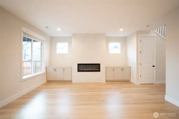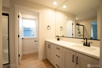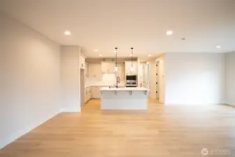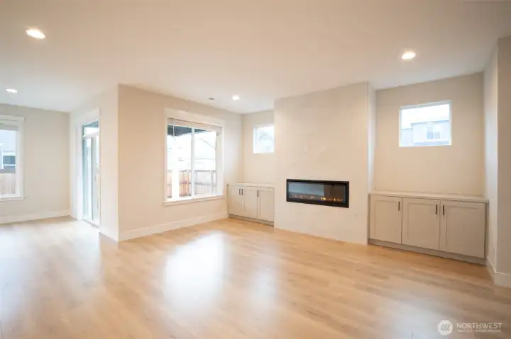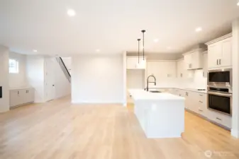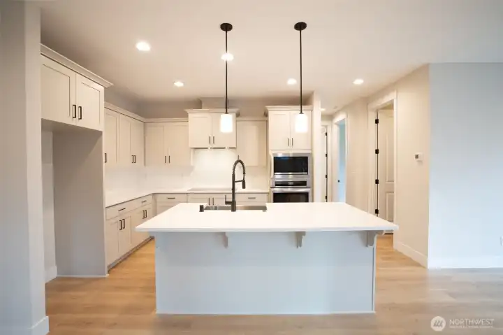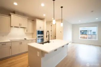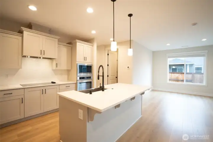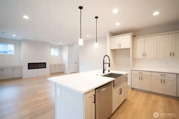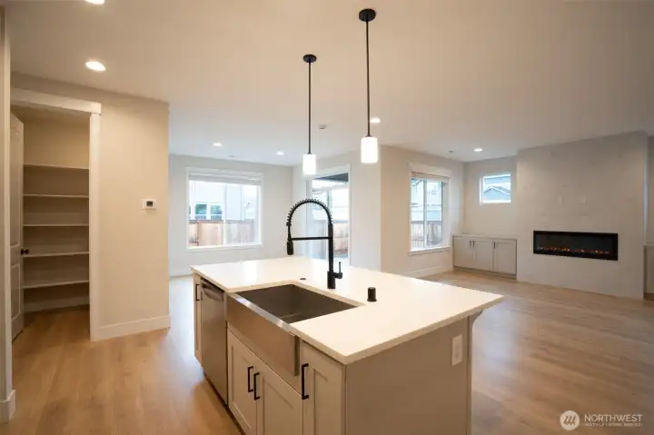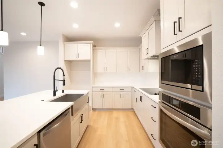Exceptional corner-lot home offering 4 beds, 3 baths, and 2,390 SF, including a main-level bedroom and full bath—ideal for guests or multi-gen living. Chef’s kitchen features quartz countertops, apron sink, full-height picket tile backsplash, wall oven with separate cooktop, built-in microwave, generous counter space, and walk-in pantry. The great room highlights a fireplace wrapped in custom tile with beautiful built-ins. Upstairs includes a large loft, laundry room with cabinetry and utility sink, and a spacious primary suite with dual vanity, walk-in shower, and large walk-in closet. Over $50K in upgrades include water-resistant flooring on main level and baths, upgraded trim package with black hardware, wood-cased windows, wood shelving, insulated garage, architectural-grade lighting, front irrigation, and a covered patio.