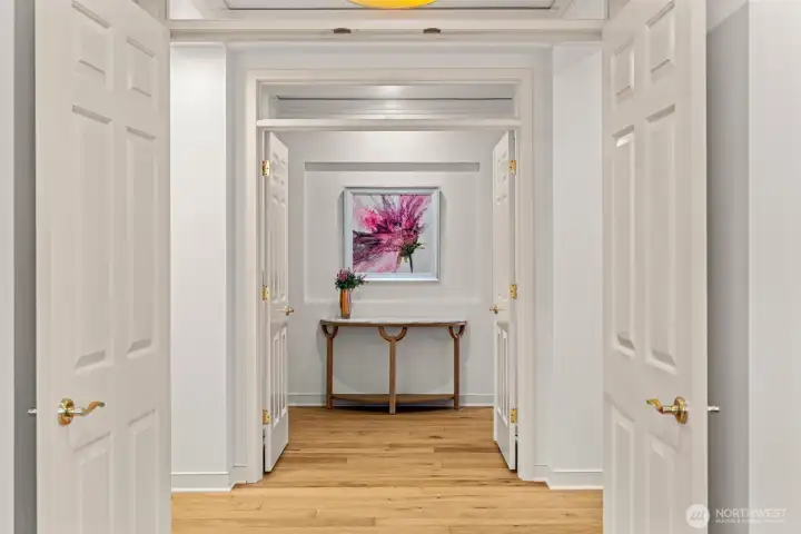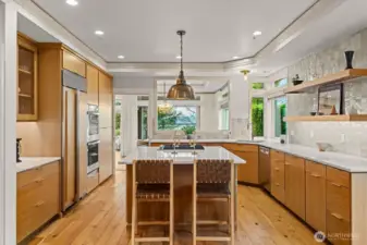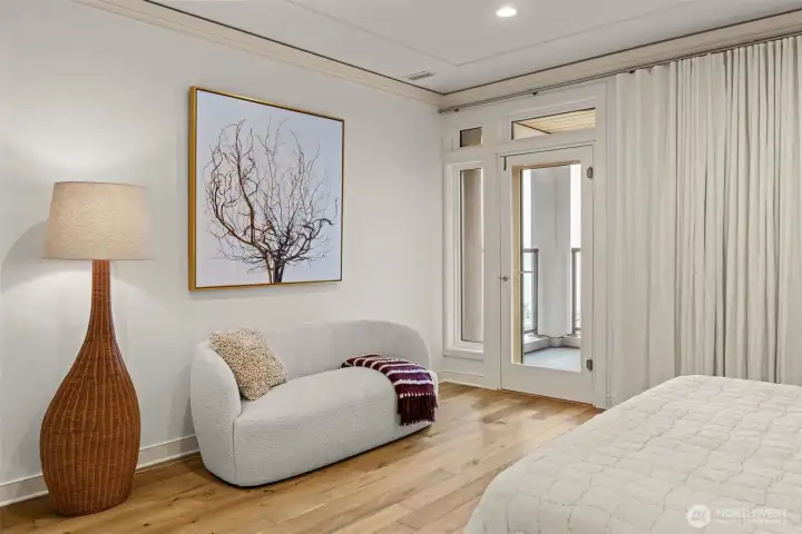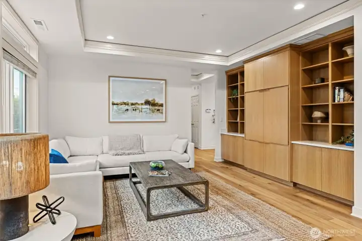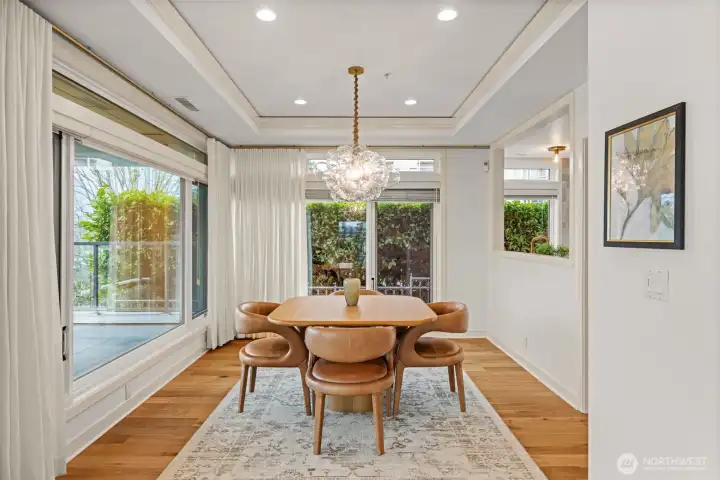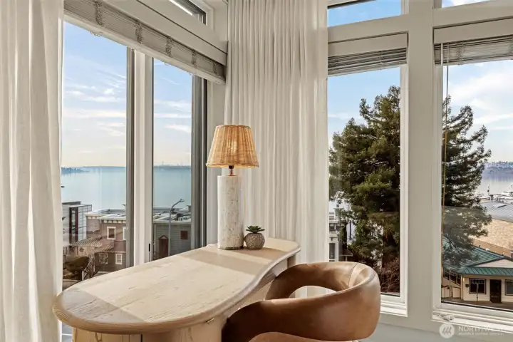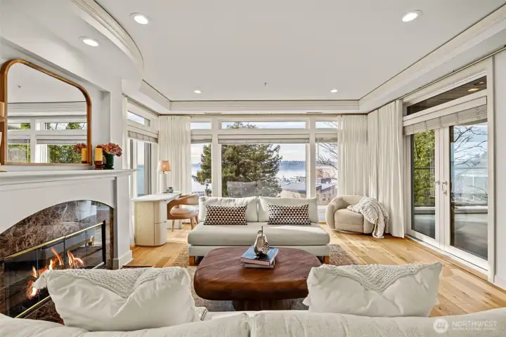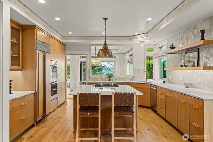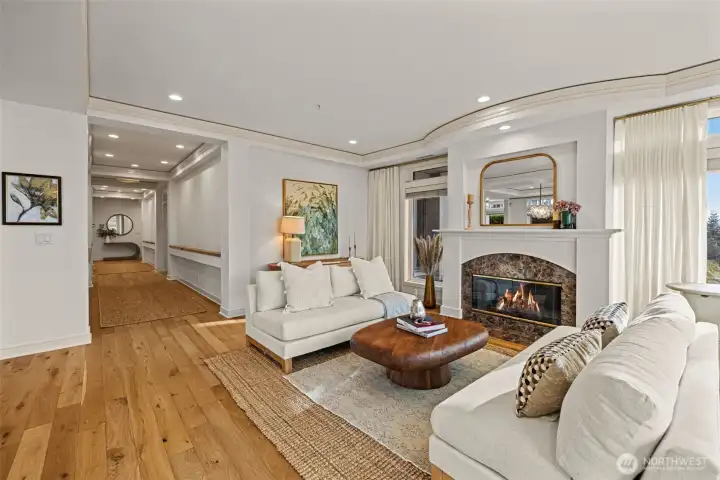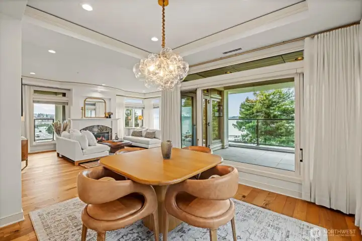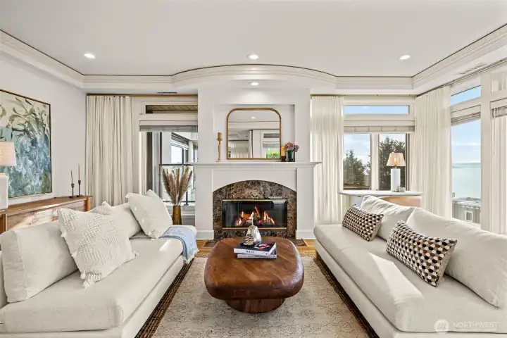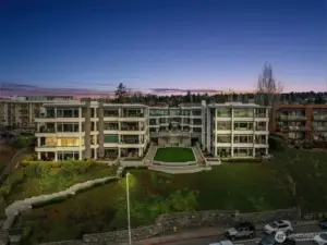 STUNNING lake-view end-unit at prestigious Marina Pointe! This elegant 2 bed | 2.5 bath | 2,318 SF home features hardwood floors, upscale finishes, and newly added recessed lighting throughout, with a dedicated office that could serve as a third bedroom. The beautifully remodeled chef’s kitchen boasts quartz counters, a large island, Sub-Zero refrigerator, stainless steel appliances, gas cooking, range hood, and abundant cabinetry with under-cabinet lighting—perfect for everyday living and entertaining. A formal dining room provides the perfect space for gatherings, while the inviting living room offers serene lake views, a cozy gas fireplace, and access to a private balcony. The spacious owner’s suite includes its own lake-view balcony, spacious walk-in closet and a luxurious, newly remodeled spa bath with Kohler soaking tub, walk-in shower, quartz vanity, and brushed gold finishes. A generous second bedroom features an en-suite bath with quartz vanity. Additional highlights include a convenient half bath, laundry room with full-size washer and dryer, secured garage with two parking spaces plus storage, and the home is offered with furnishings included for a seamless move-in experience. Well-maintained HOA; The complete building exterior was recently redone including windows and siding. No rentals allowed. Prime location just minutes to downtown Kirkland, Lake Washington, parks, shopping, dining, and award-winning Lake WA schools. A rare opportunity—don’t miss it!