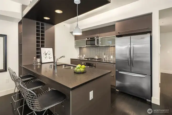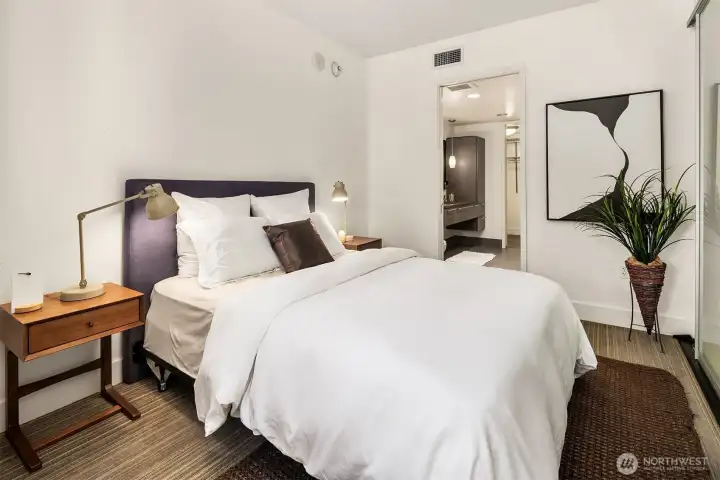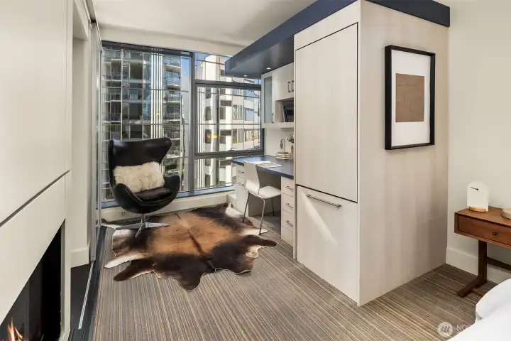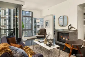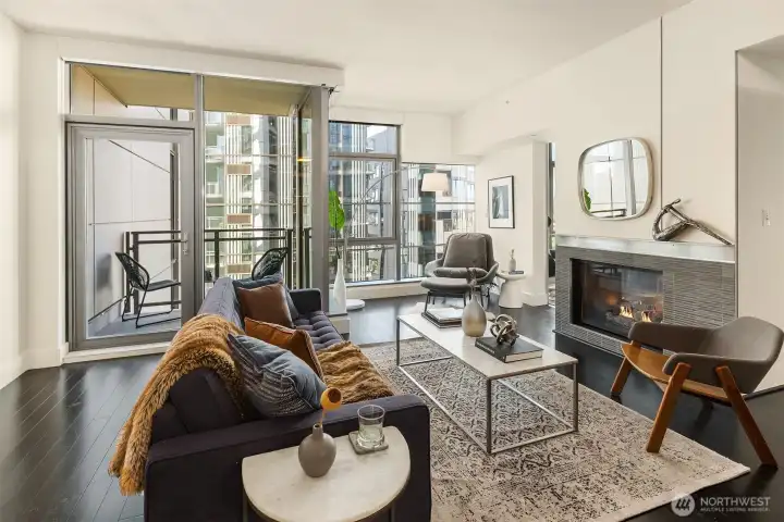 Welcome to Enso, A LEED certified building in the heart of bustling South Lake Union. Largest one bedroom floorplan in the building with just under 1,000 Sq ft. This unit features walls of windows, extensive custom built ins, a duel sided living room/bedroom gas fireplace, central AC and a covered deck. The large primary suite features a high end built in office nook. Spa like bath with huge soaking tub, large walk in closet and a kitchen featuring high end appliances, plus a powder room off the entry. Garage parking and storage unit included. This building exudes quality and is excellently managed and maintained. Building features include gym, party room, guest suite, and shared entertainment deck. Prime location, truly the place to be! Pet friendly and steps to light rail, buses, and streetcar.
