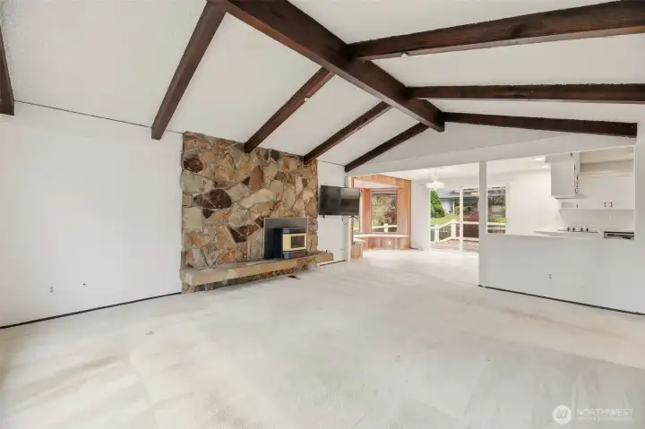 Lake Stevens opportunity on a large corner lot! This 3-bedroom, 3-bath, 2,310 sq ft home offers strong bones and endless potential for the buyer ready to make it their own. The living room showcases vaulted ceilings with wood beams and a fireplace—an ideal canvas for a dramatic update. The kitchen features a generous eating area and charming bay window seating, ready for a modern refresh. Lower level offers excellent mother-in-law or multi-generational living potential. Enjoy a large deck, level backyard with firepit, and plenty of space to enhance outdoor living. Primary suite includes cedar closet and private bath. Two-car garage plus ample additional parking. Located in the desirable Lake Stevens School District. Bring your vision and unlock one of the best value opportunities in Lake Stevens.