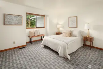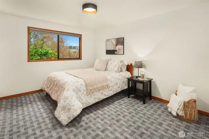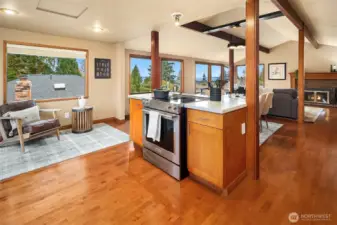 4-bed walkable Edmonds Bowl home privately tucked on 7th Ave. Top floor great room w/ vaulted beamed ceilings & details. Oversized windows w/ views of the Puget Sound & Olympics. Wood-burning fireplace. Updated kitchen w/ shaker-style maple cabinetry, slab quartz countertops, & all SS appliances. Hardwoods throughout. 3-beds on main including the generous Primary Suite w/ ¾ en suite bath featuring dual sinks, large walk-in shower with glass barn-style door & skylight. Walk-in closet. Huge lower-level bonus w/ built-in media cabinet & gas fireplace. Front & back decks extend entertaining outdoors. Tankless water heater. Turnkey & meticulously maintained. Walk to farmer’s market, shopping, coffee, & eats.