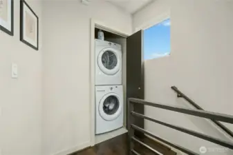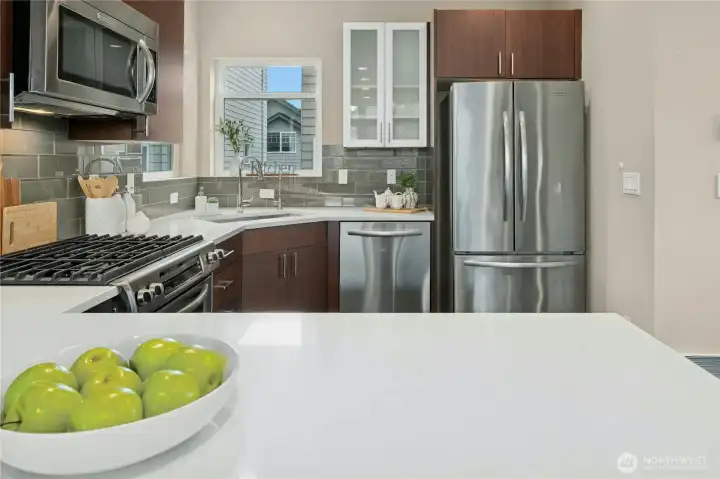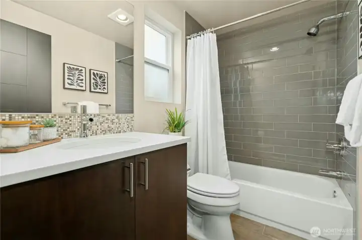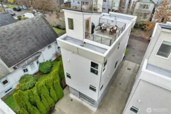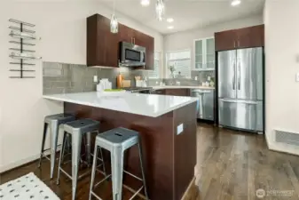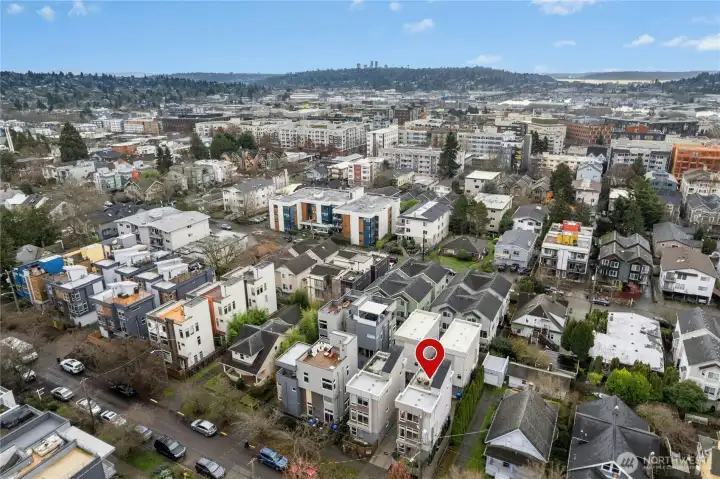 This is truly the one you've been waiting for! A full stand-alone, multi-level, 3 bed, 2.25 bath, 1,250 square foot home in the heart of Ballard with no shared walls, no HOA, and no parking concerns. A full-size single-car garage with workshop space adds rare convenience, while a modern floor plan leads to multiple living options. Upon entry, the main level features a flexible bedroom/den/office with a private patio and full bath, ideal for guests or working from home. The kitchen is thoughtfully designed with stainless steel appliances, a gas range, quartz countertops, and an informal eating bar, blending function and style. This level showcases real hardwood flooring, while windows on all sides fill the home with natural light. Upstairs, you’ll find the primary bedroom and third bedroom, both offering custom closet built-ins and top-down/bottom-up shades for light and privacy as well as newer carpeting for that soft touch under foot. At the top, the rooftop deck provides neighborhood views and a private outdoor retreat, complete with a natural gas BBQ hookup—perfect for entertaining or unwinding. Located in an amazing Ballard location with a Walk Score of 96, just steps to the Ballard Farmers Market, shops, coffee, restaurants, bars, and retail.