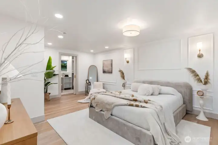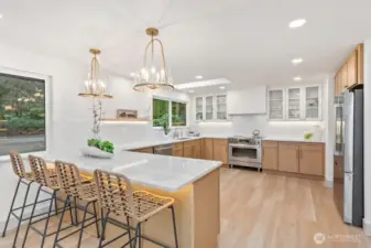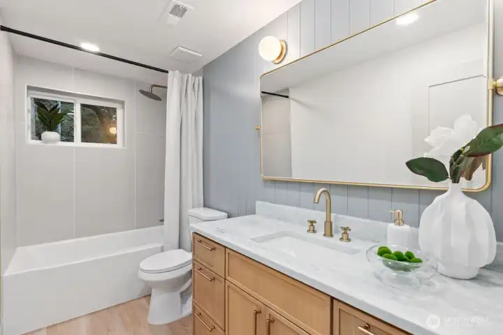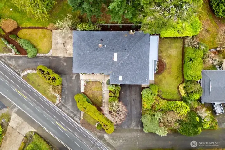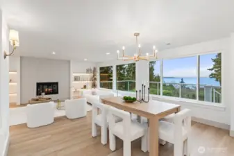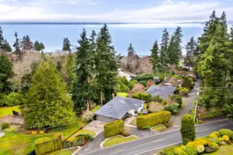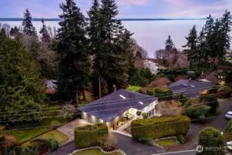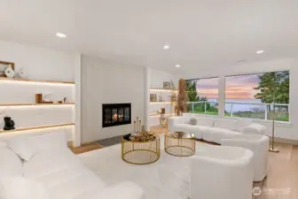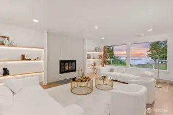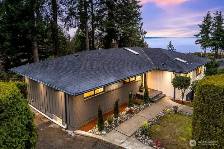 Breathtaking Panoramas. This extraordinary 5-bedroom, 3-bathroom fully remodeled oasis captures sweeping Puget Sound and Olympic Mountain vistas, offering unobstructed beauty and unforgettable sunsets. Designed for both entertaining and everyday living, the home features expansive gathering spaces, seamless flow, and exquisite designer finishes throughout. The chef-inspired kitchen is a showpiece, with custom cabinetry, rare luxury countertops, premium appliances, and refined detailing. The living room is anchored by a striking custom accent wall with floating shelves and integrated lighting, blending warmth and style. The primary suite is a serene retreat with a walk-in closet and spa-inspired bathroom showcasing a dramatic custom “arch shower” with sophisticated tile and fixtures. The main level also includes two additional bedrooms and a beautifully appointed guest bath. The lower level offers two more bedrooms, an expansive family room with a wood-burning fireplace, and flexible space for guests or multi-generational living. Upgrades include a brand-new roof, new electrical panel, high-efficiency furnace, heat pump, water heater, custom stair lighting, and extra parking with a rare roundabout driveway. Every detail exudes luxury and comfort—this is an elevated lifestyle in a home that truly takes your breath away. Welcome home.