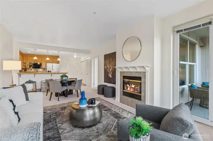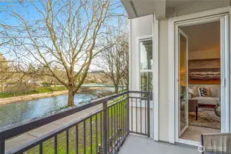 Impeccable 2 bed / 1.75 bath condo with stunning Cedar River and trail views. Enjoy reading a book on the covered balcony while taking in peaceful water views and sound, or sip your morning coffee in front of the fireplace while overlooking the view through expansive windows. Light-filled interior features soaring 9-foot ceilings and a covered patio for year-round enjoyment. Truly move-in ready with brand-new carpet and fresh interior paint throughout. The well-appointed kitchen offers bar seating, abundant cabinetry, a spacious pantry, new flooring, and new stainless steel appliances including refrigerator, dishwasher, and microwave. Open-concept layout with in-unit washer and dryer. Secure building with 1 designated garage parking and a huge, assigned storage room. Community amenities include a library with seating area, elevator, outdoor patio, and a scenic walking trail along the Cedar River. Walk to downtown Renton, coffee shops, transit center, shopping and restaurants. Building superbly maintained by a strong HOA.