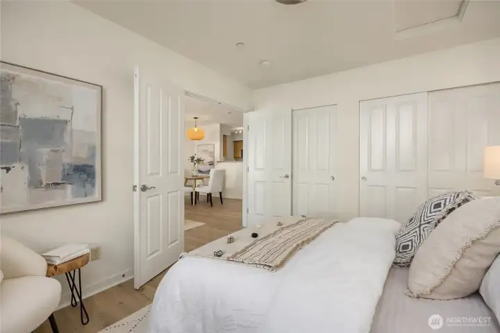 Chic residential condominium located on the peaceful TOP FLOOR of the popular Island Crossings Complex. Ideally located near shopping, medical services, the library and everyday conveniences. Designed for comfort and simplicity, this lovely one-bedroom turn-key residence offers effortless one-level living with controlled access, elevator service and gated parking for a car you may never need. The open-concept kitchen is appointed with granite countertops and stainless steel appliances, flowing seamlessly into the living space featuring a Juliet balcony overlooking the serene central courtyard. Double doors open to a spacious primary suite with generous closet space. Upgraded with Pergo hardwood laminate flooring throughout, enhancing the home's modern, move-in-ready appeal. With its desirable top-floor setting and close proximity to the Sound to Olympic Trail, this thoughtfully designed condominium is ideal for those seeking a sophisticated, low-maintenance lifestyle without compromise.
