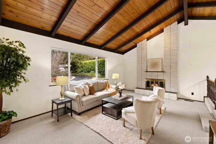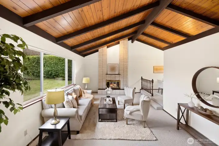 Welcome to the quiet neighborhood of Cedar Crest Estates. Tri-level with 3 beds 2 bath on an oversized 17,444sf lot surrounded by mature trees, blooming shrubs & a rose garden. Welcoming Circular Driveway provides access to the 2-car garage and plenty of room for RV, boat or projects. As you enter, it's all about the Dramatic Wood Vaulted ceilings, the original floor-to-ceiling stone fireplace, and an abundance of natural light throughout. Open living, step-up Dining, dining leads to kitchen with eating space and sliders to the BBQ patio with plenty of yard space for entertaining. Stairs off kitchen lead to upper-level loft/bonus room with a large south-facing deck for fun and sun, 3 beds and a full bathroom. The larger room has a balcony overlooking the gardens. Lower level includes 1 bedroom, powder/laundry room and entrance to the garage. Estate "sold as is". New Septic 6/2025. Updated gas furnace. 10mins to freeways, grocery & all that the Puyallup's South Hill mall has to offer. 2004 Saturn Car in the garage is included in the home sale.