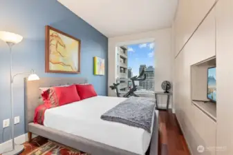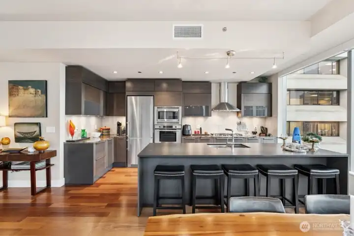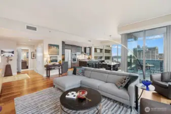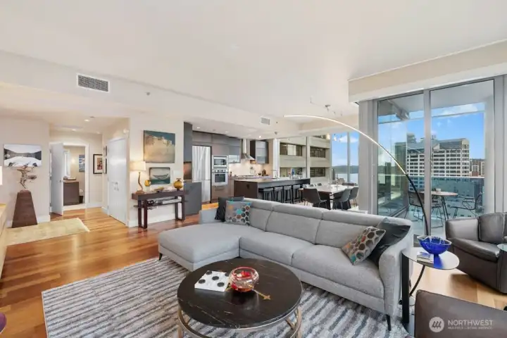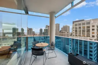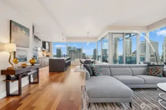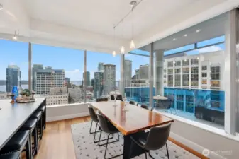 Set in one of downtown Seattle's most coveted locations, this exceptional two bedroom residence at Olive 8 defines elevated urban living. Floor to ceiling windows showcase sweeping views of the skyline, Puget Sound, and the Olympic Mountains. The refined, open floor plan is ideal for entertaining, featuring a chef's kitchen, elegant dining area, and a living room with fireplace that opens to a spectacular corner lanai. The primary suite offers romantic views, a generous walk-in closet, and a spa-like bath. A serene guest suite with custom built-ins and a private bath, plus a dedicated office, complete the home. Enjoy world-class amenities shared with the Hyatt and step outside to Seattle's premier dining, shopping, and culture. Easy access to lightrail and Pike Place Market.