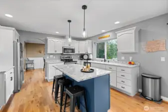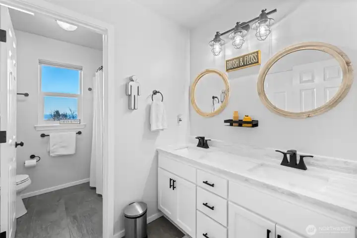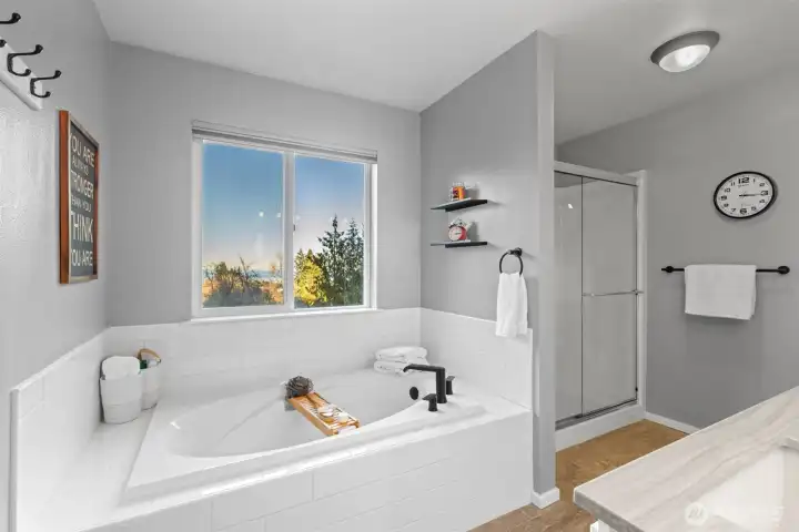 New year, new look--and better than ever! Immaculate 3BR+office+den+formal dining, 2.5BA home in a sought-after Mt. Angeles neighborhood in Port Angeles. Situated on 1.34 pristine acres, with views of the Straits, circular drive with modern lighting, curbing, natural landscaping, firepit, concrete RV pad with water, septic, and power, storage shop, composite decks (envision a hot tub--the wiring is there!), bold new garage door, covered porch leading into an updated comfortable living space you'll love; tall ceilings, striking hand railings, hardwood floors, wainscot, refreshed kitchen cabinets, quartz counters, stainless appliances, large living room windows to vaulted ceilings taking in the views, new floor-to-ceiling statement shiplap with electric fireplace, primary suite with walk-in closet and soaker tub with views to Canada, and a private office that could be used as a fourth bedroom. Oversized attached garage (nearly 1000SF!) with workshop, workout area, or open it up to one big space. Too many details to mention--must see in person!