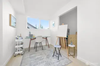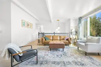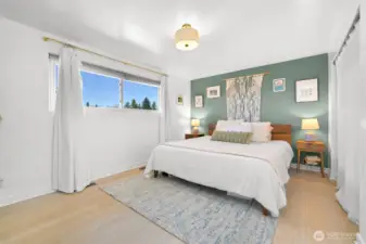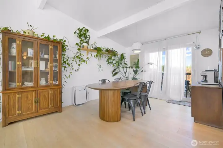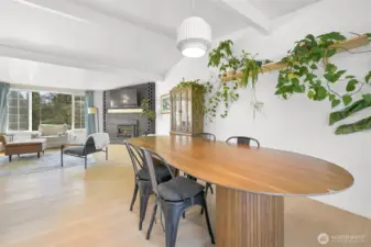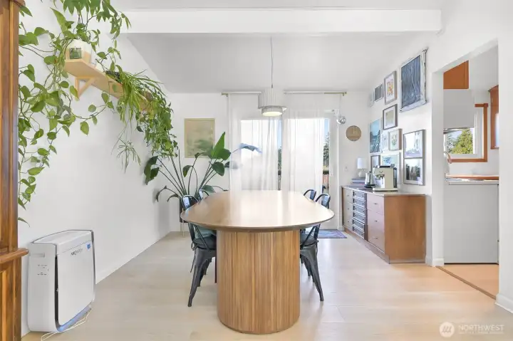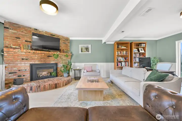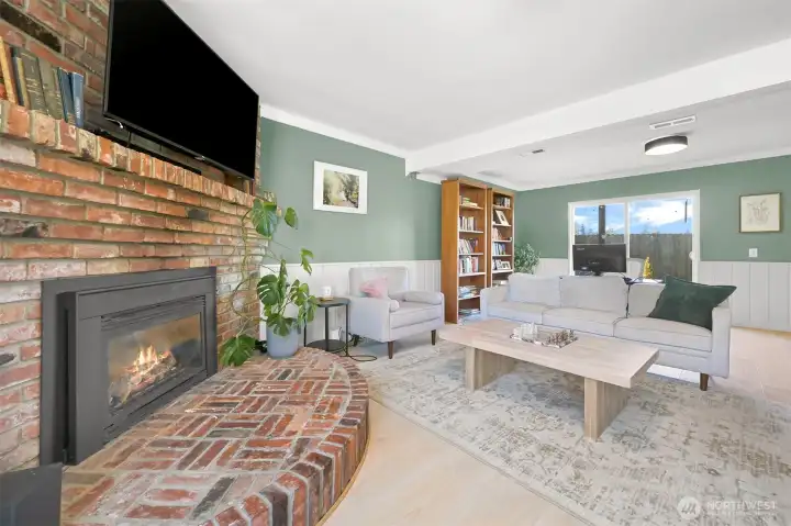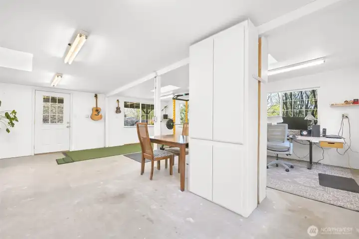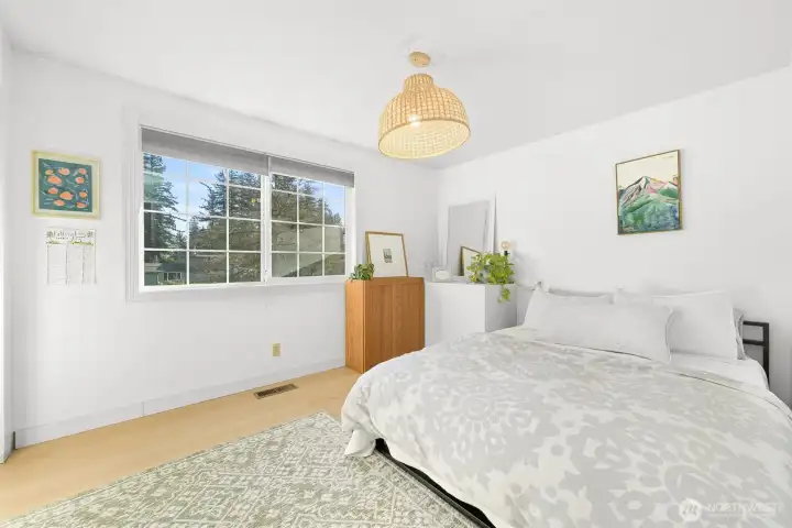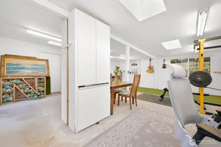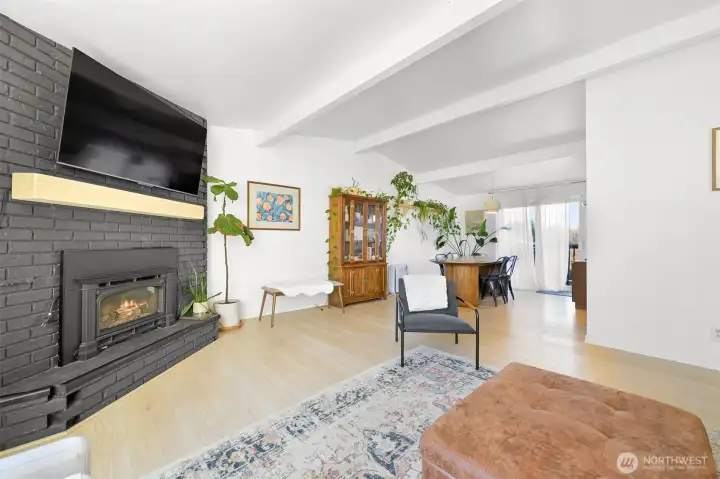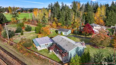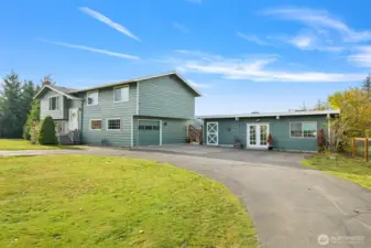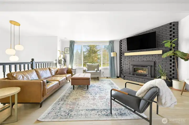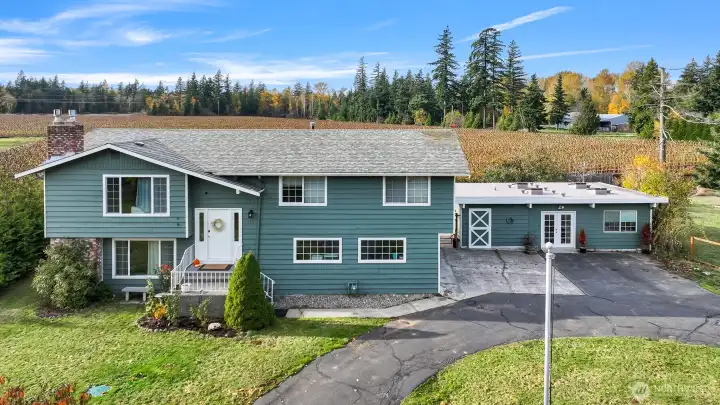 Updated mid-century home at the end of a quiet cul-de-sac on 1.5 flat acres. Light and bright living spaces with vaulted ceilings and abundant natural light year-round. Updated wide-plank white oak LVP flooring throughout and interior paint create a clean, modern feel, complemented by 2 accent brick fireplaces on each level. Open main-level flow connects the living and dining rooms to a functional kitchen with original wood shaker cabinets. Dining room opens to an oversized deck overlooking the backyard. Spacious primary bedroom features an updated ensuite with beautiful accent tile. Main floor offers two additional bedrooms and recently updated bathroom with upgraded tile bath/shower. Daylight basement offers flexible living space. Fully fenced, level acreage includes shop space and an attached studio with potential for ADU conversion. Extensive updates throughout have enhanced the home's style an functionality.