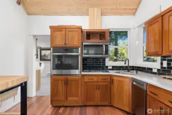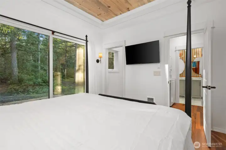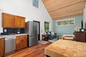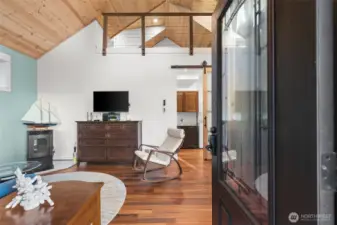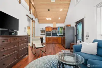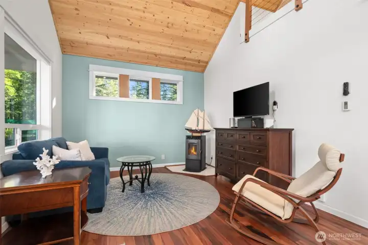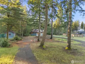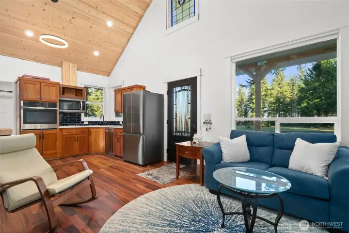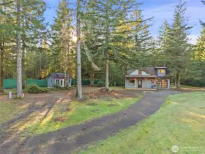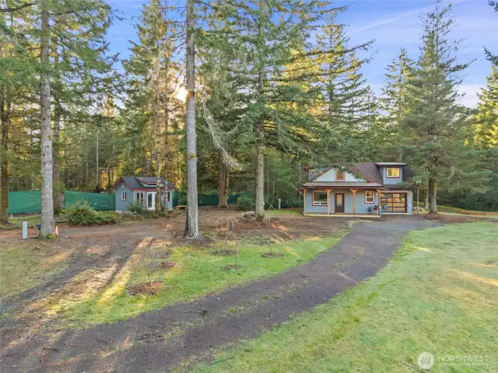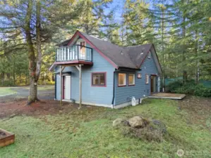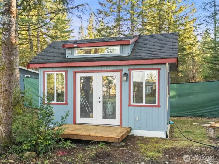 Small but mighty! Tiny home on a view acre at Union. This custom crafted home with vaulted blue pine wood ceilings, main level bedroom and a open loft will leave you speechless! Barely lived in, features include solid counters, ss appliances, gas cooktop, skylights, dormers, custom lighting, barn style interior doors, Tigerwood hardwood floors & pellet stove. Family room features a glass roll up door perfect for those summer days. Covered front deck plus second deck off of the bedroom. Cozy sleeping loft with small sundeck. Matching 8 x 12 storage building. Wired and plumbed with RV connections for visitors or income potential. Beautiful level, park-like acreage with territorial views of the Canal and Olympic mtns in the distance. 3 bedroom approved septic.