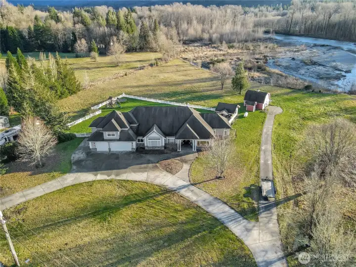 {UNPARALLED MOUNTAIN VIEWS AND YOUR OWN RIVERFRONT} are offered with this custom home on 7 acres of pasture! Bring your horses. . . or not! Inside, a grand entry w/ a wall of windows off the formal dining room framing snow covered, Whitehorse Mountain. Soaring ceilings, tiled entry into dining & kitchen. Oversized den/office off entry with French doors. Primary suite has double door entry, slider to patio, large walk-in closet and private 5 piece bath! Tiled flooring, dual vanity, walk-in tiled shower, claw foot bathtub & Travertine flooring! Meander back out into the living area & explore the gourmet kitchen boasting SS appliances, double oven, abundant cabinetry & seamless Corian countertops. Island has granite slab & eating bar. Walk in pantry for your small appliances too! Family/great room is spacious & offers built in bookshelves-either side of the gas fireplace for cozy movie nights! Off the hallway, 2 bedrooms, a 3/4 bath (wheelchair accessible), utility room w/ sink & cabinetry for additional storage. Oversized, finished 3 car garage (currently being used a gym) is large enough for all of your toys/vehicles. Upstairs (wired for chair lift) is an attached, 1 bedroom, 1 bath fully equipped apt. w/ a stackable washer/dryer. Separate space for relative, caretaker, or additional income! Outside a 2000 sq. ft. patio, fenced yard area, hot tub and an outdoor living area w/ eating bar, built in barbeque & f/p for entertaining + small barn/shop. 536 ft. of riverfront too!!!