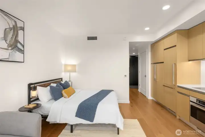 Discover East-Facing Studio 1211, an ideal choice for your first home or a chic urban retreat, offering premium downtown living at an exceptional value! This bright unit boasts floor-to-ceiling windows, elegant quartz countertops, hardwood floors, A/C & smart home system. The modern kitchen features a stainless-steel oven, Grohe fixtures, and stylish wood-paneled built-in appliances. Enjoy amenities including 24/7 concierge, dining rooms co-working lounges, fitness center, theater, Sky Club rooftop outdoor spaces & a dog run with wash station. Pets friendly. No rental cap!