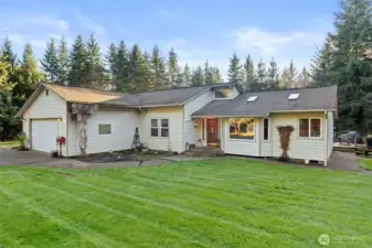 Private country living on 5 beautiful acres with a 2186 sq ft 3-bedroom 2 bath home offering space, comfort, and versatility. The primary suite features a walk-in closet and attached bath with a jetted spa tub. Vaulted ceilings and skylights provide abundant natural light. Home is equipped with central vacuum, two hot water heaters, and a heat pump with A/C. Laundry room includes a built-in desk and ironing board. Cozy living area showcases a newer propane fireplace insert with a brick surround. Home has 456 sq ft attached garage.Outdoor features include a 75' x 25' deck reinforced for hot tub, sprinkler-irrigated lawn, apple trees, and established vegetable gardens with blueberry and raspberry bushes, all set with a beautifully landscaped ground. Wooded acreage offers trails and privacy. Impressive 60' x 30' shop with 14 ft doors, gas heater, large loft, and shower, toilet, and sink- ideal for hobbies, storage, or workspace. Assumable VA loan under 3% interest (buyer to verify). Peaceful setting with room to live, work, and enjoy the outdoors.