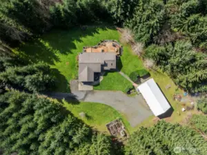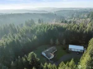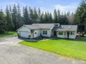 Private country living on 5 beautiful acres with a 2186 sq ft 3-bedroom 2 bath home offering space, comfort, and versatility. The primary suite features a walk-in closet and attached bath with a jetted spa tub. Vaulted ceilings and skylights provide abundant natural light. Home is equipped with central vacuum, two hot water heaters, and a heat pump with A/C. Laundry room featuring folding table and ironing board. Cozy living area showcases a newer propane fireplace insert with a brick surround. Home has 456 sq ft attached garage. Also a 60' x 30' detached shop with 14 ft doors, gas heater, large loft, and shower, toilet, and sink- ideal for hobbies, storage, or workspace. Outdoor features include a 75' x 25' deck reinforced for hot tub, sprinkler-irrigated lawn, apple trees, and established vegetable gardens with blueberry and raspberry bushes, all set with a beautifully landscaped ground. Wooded acreage offers trails and privacy. Has marketable timber. Assumable VA loan with 2.25% interest rate and roughly 395k balance. Peaceful setting with room to live, work, and enjoy the outdoors.