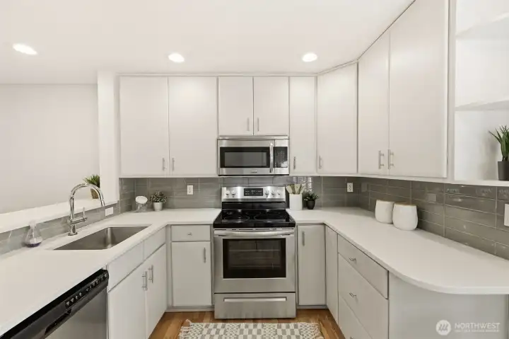 Welcome to this beautifully updated Seattle townhouse, offering 1,240 sq ft of bright, well-designed living in a prime location. Large windows throughout flood the home with natural light from morning to evening, creating an airy and welcoming feel. The main level features freshly refinished hardwood floors, while the upper level is finished with easy-care laminate wood flooring for a modern, low-maintenance touch. The stylish kitchen boasts solid surface countertops, soft-close drawers, and stainless steel appliances, with a spacious breakfast bar that flows seamlessly into a dedicated dining area - ideal for everyday living and entertaining. Upstairs, you’ll find vaulted ceilings, ceiling fans in the bedrooms, a Jack-and-Jill bathroom, and a convenient optional laundry closet in the hall. The versatile lower level includes a private bedroom and ¾ bath, making it perfect for a home office, guest suite, or additional living space. Step out onto the south-facing back deck, a sun-soaked retreat for relaxing, summer meals, or gatherings with friends. Additional highlights include a 1-car attached garage, driveway parking, no HOA dues, and an unbeatable location less than a mile from the Future N 130th St Light Rail Station. Close to parks, shopping, dining, I-5, and public transit, this home delivers a smart blend of comfort, convenience, and urban lifestyle.