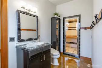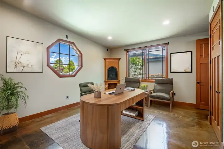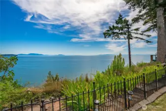 Perched directly on a high-bank bluff with approximately 80 feet of waterfront, this south-facing home offers front-row views of the Strait of Georgia, San Juan Islands, and Mt. Baker. The scenery shifts with the light, seasons, & eagles that soar over the bay—an ever-changing backdrop you’ll never tire of. Large, flat driveway provides parking for 5+ vehicles, a rare waterfront convenience. Inside, a dramatic 14’+ entry, smoked-glass French doors, & an inlaid compass rose set the tone. Polished concrete floors with 9-zone radiant heat, tall interior doors, & walls of windows frame the views throughout. The great room is anchored by a striking 4-sided fireplace, while a waterside bonus room offers flexible space for an office, hobbies, or studio. The chef’s kitchen features Brazilian granite, a 48” Viking range, new Thermador refrigerator & Bosch dishwasher (2023), & a massive 5’ x 15’ pantry large enough for a second or third refrigerator. Main floor primary suite with water views, soaking tub, curb-less shower, & an impressive 208 sq ft walk-through closet. A 1,061 sq ft guest suite above the garage includes a living room, private bedroom, full bath, & Mt. Baker views. Outdoor living shines with a covered waterside patio, built-in BBQ & rotisserie, seaside hot tub, & mature landscaping anchored by a rare 70’ sequoia. A metal roof, 36 solar panels, whole-house generator (2022), & an average electric bill of just $7.49/month make this home as efficient as it is stunning.