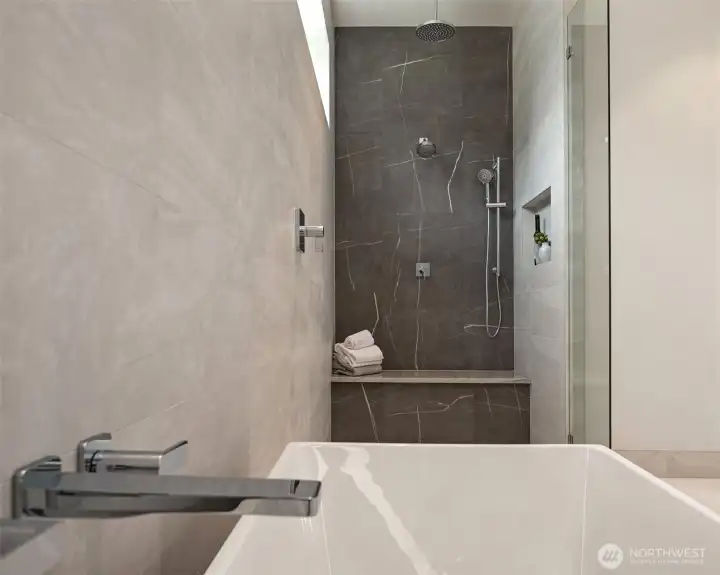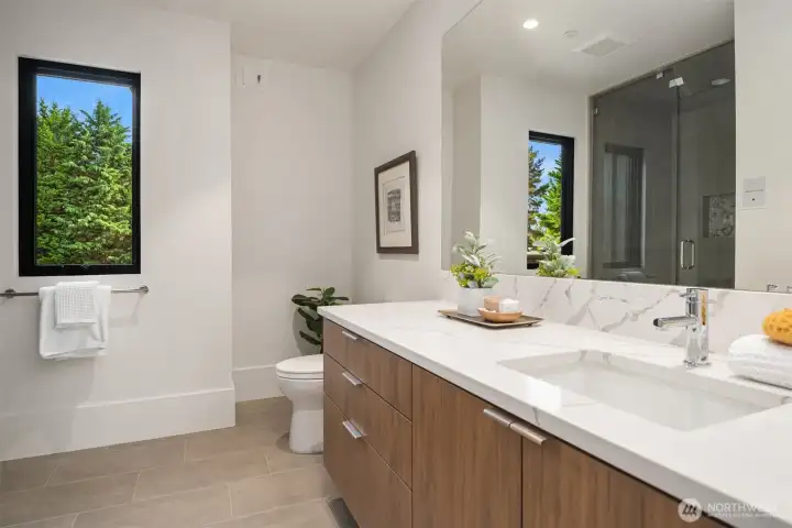 Attention to detail and craftsmanship are personified in this stunning new home built by respected local builder JBeloff Homes. Located down a private lane, this home is perched high to ensure privacy while giving you west facing, panoramic, horizon views making you feel like you are eye level with the Olympic Mountains. A beautiful combination of indoor and massive outdoor space allows you to squeeze every last moment of sunset year-round. Phenomenal bedroom layout with a spacious primary wing on the main floor with zero steps next to an elevator that services all floors. Upper floor has two gorgeous bedroom suites, one with west facing views and the other with downtown views surrounding a beautiful family room. Lower floor is wonderfully bright with high ceilings and an additional 3 large bedrooms, recreation room, secondary laundry, home theater, and flex room perfect for home gym, hobbies, and prewired for a golf simulator. Several options for den and home office. Natural light pours through near floor to ceiling windows that clears the mind and refreshes the soul. Sophisticated design elements hand chosen to be warm and welcoming. Secure private yard and gate ready for 360-degree security and peace of mind. Home has 3 car attached garage plus detached heated auto-salon perfect for a collector car, storage, or separate gym. Amazing location minutes to Overlake Golf & Country Club, Medina Elementary, St Thomas, 520, I-405, numerous parks, beaches, and downtown Bellevue