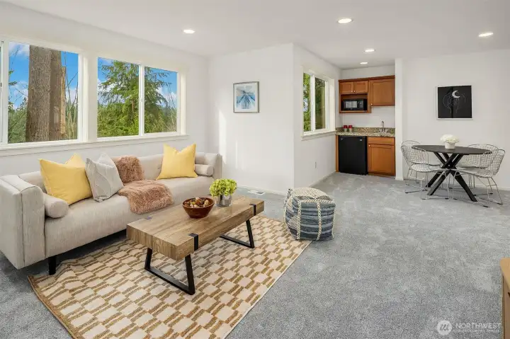Elevate your lifestyle by design in this stunning 2-story craftsman, tucked away on a quiet, tree-lined street and surrounded by serene greenspace. Fresh paint, wide-plank engineered hardwood fllors and brand new carpets create a crisp, move-in-ready feel throughout. Tastefully upgraded kitchen with quartz countertops, pristine white and gray cabinetry and gas cooking - finally a space worthy of your culinary ambitions. Dual-sided fireplace warms both the great room and dining room. Retreat to the primary suite with soaring ceilings, cozy fireplace and spa-inspired bath designed for relaxation. The upper level versatile loft for entertainment or unwinding, framed by peaceful views of the woods and the Olympic Mountains. Main floor bedroom perfect for remote work or hosting guests. Walking distance to neighborhood park. Highly rated Hilltop Elementary & Mountlake Terrace High. Close to Alderwood shopping center. Easy access to I405 to Bellevue; I5, and Light Rail to Seattle.