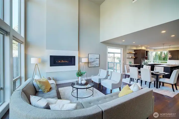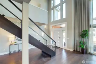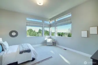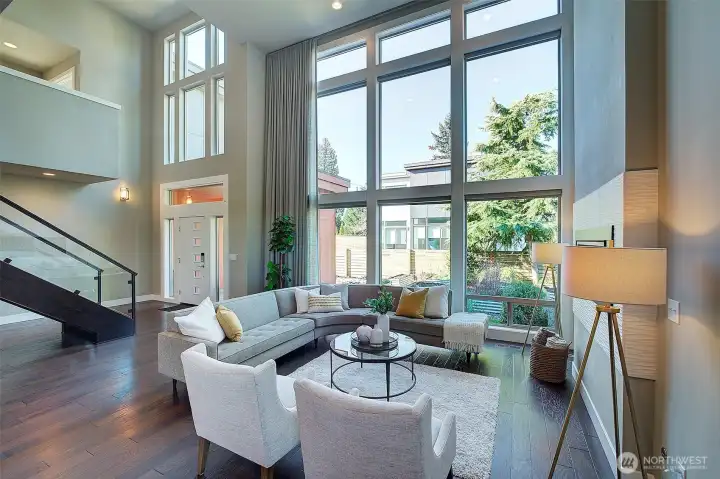 Enter this spacious sunny and bright great room with 18 foot high ceiling and windows to match. Floating staircase adds a special magical touch. Prepare to be amazed by this gorgeous Modern 4 bedroom, 3.25 bath with territorial view tucked back off the street for privacy. Roof is TPO. Upper level laundry room for convenience. Primary suite bath has free-standing tub, double sinks and huge walk-in closet. Bonus room on upper level has been the "movie" room and can double as a den. Main level guest suite has deck access. Double car high ceiling garage is extra deep with room for all your toys. 2 decks near Kitchen /Dining room provide seasonal al fresco dining. Hardwood floors, quartz countertops in kitchen and baths...truly a thoughtfully conceived and well maintained home. Original owners have made many improvements to this 10 year young property. Including: Bosch induction cooktop, High capacity Heat Pump, Level 2 EV charger, Solar panels (34), HEPA air purifier, XFinity security system, Honeywell thermostats, raised fruit & vegetable garden area (with irrigation system). Many mature plantings and perennials throughout the yard create additional privacy, garden shed. Centrally Located with a "Walkscore" of 78 . Just 1 mile north of Green Lake, 10 minute walk from Northgate, Kracken Hockey Arena and Light Rail, easy walking distance to many restaurants and shops , AMC theater , North Seattle College and medical clinics.