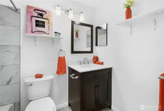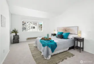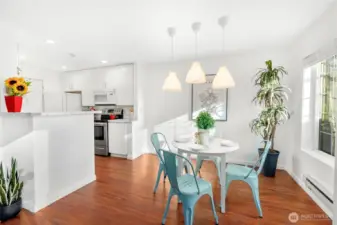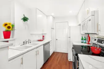 Form & Function. Fresh paint, Fresh carpet! Clean lines, LVT floors, high ceilings, Newer fixtures and finishes, Warm fireplace, big windows fill rooms with natural light. Dining area off functional kitchen and flows nicely into main living area. Newer dishwasher, newer washer and dryer and all stay. Vaulted ceilings in primary bedroom with a bay window, walk-in closet & full bath Two sizable additional bedrooms, one with vaulted ceilings; half bath on main; all baths stylishly updated. Patio, privacy fence, attractive treed setting. Inviting ground floor brick entry, one car garage, plus one prkg space. Close to main commutes, transit, numerous amenities, recreation.