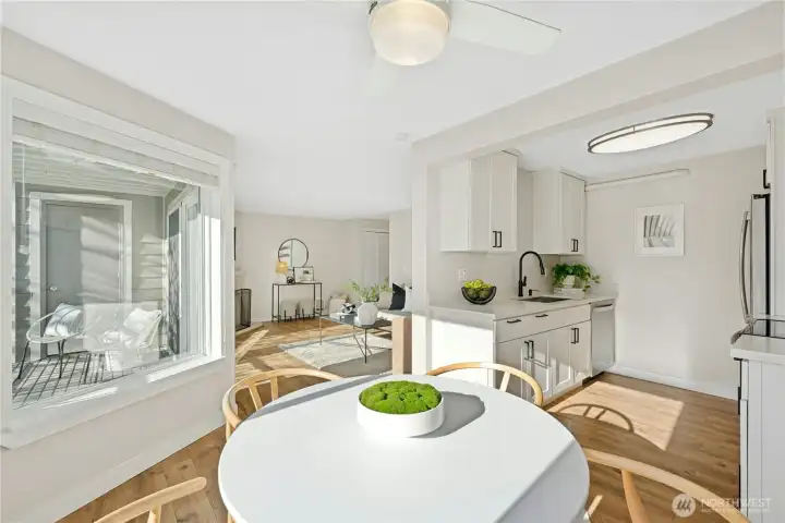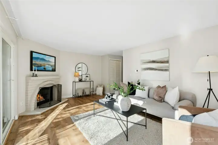 This sunny and inviting condo has been completely renovated from top to bottom. The interior is adorned with beautiful hardwood floors, crisp white cabinetry, quartz stone countertops, LED lighting and even smart thermostats. This is an end unit, which means it has extra windows and tons of natural light. Cozy up by the wood-burning fireplace or step outside to the covered balcony for morning coffee. The primary bedroom easily fits a king-size bed and offers an enormous closet with built-in shelving. There are two separate bath vanities and a new double-sized walk-in shower. The included washer and dryer are happily sitting side-by-side in their own dedicated laundry room with extra storage cabinets. Beautifully updated community with newer roofs, stairways, decks, railings, etc. Lots of guest parking here and this unit comes with a reserved covered parking space. Just steps to shopping, dining, parks and schools. Commuting is a breeze with easy access to I-405 and express transit. Only 6 minutes to the Village at Totem Lake and 5 minutes to the Woodinville Wine District.