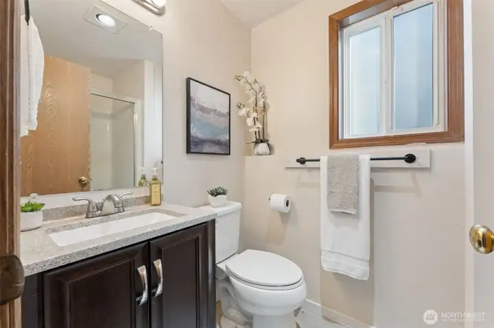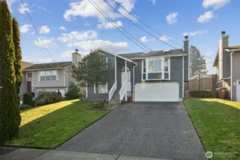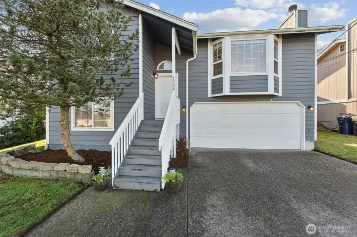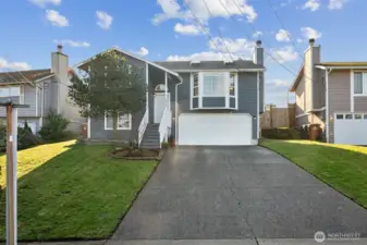 Welcome to this beautiful, light and bright, 3 bedroom, 1.75 bath home with a great split-level layout and spaces for everyday living and entertaining. Upstairs offers 2 bedrooms, a full bath, vaulted ceilings with skylights, and an inviting living room with fireplace and dining area next to an updated kitchen with ample counter space, peninsula island and bar seating. Enjoy the downstairs bonus room, great for media, gym, or extra space along with the 3rd bedroom and 3/4 bath. Mini-splits located upstairs and downstairs for your heating and cooling needs along with a built-in security system. On a clear day, enjoy the Olympic Mountain view from the living room. Enjoy year-round outdoor living with a spacious upper deck for gatherings plus a covered lower patio that’s ideal for rainy days. Fully fenced backyard with grass, flower beds and a raised garden bed for easy gardening. Large 2-car garage (washer & dryer) stay! Convenient location close to JBLM, freeway access, shopping, and restaurants.