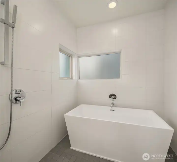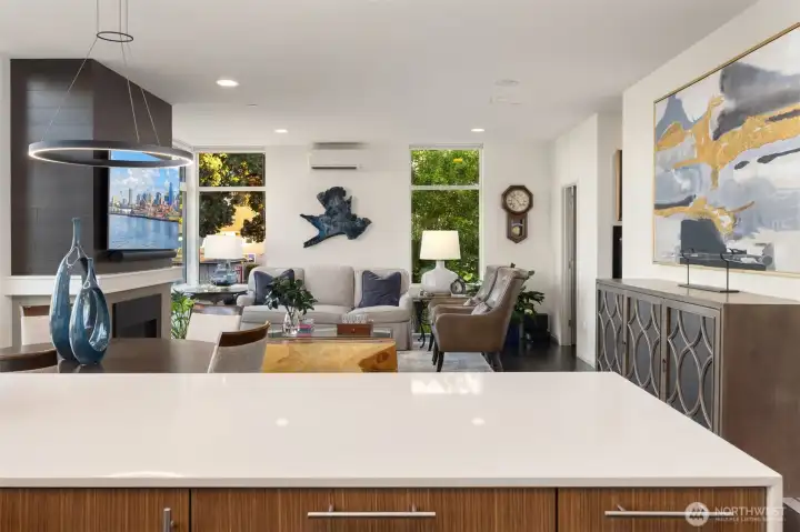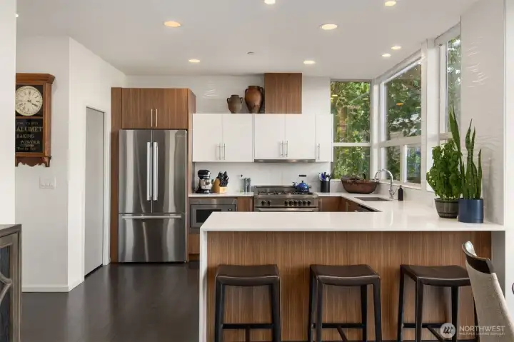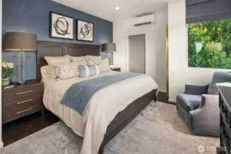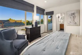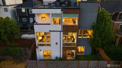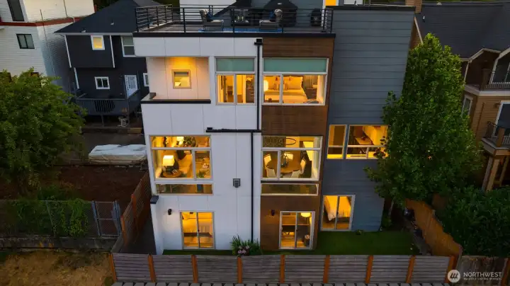 Stunning modern stand-alone home in the heart of Madrona, just steps to parks, cafés, and neighborhood favorites. Thoughtfully designed across four levels, the lower level offers two bedrooms and a dedicated office opening to a private patio—ideal for guests or work-from-home flexibility. The light-filled main level impresses with soaring ceilings, floor-to-ceiling windows, and a cozy fireplace, anchoring the open living space. The chef’s kitchen features sleek cabinetry, quartz countertops, premium appliances, and a large island perfect for entertaining. Upstairs, the luxurious primary suite includes a spa-like bath, custom walk-in closet, and a private balcony. The show-stopping rooftop deck delivers sweeping views of Lake Washington, Mt. Rainier, the Cascades, and the Bellevue skyline. Enjoy water, mountain, and skyline views from three levels. Extensive upgrades include custom dining room light fixture, refrigerator, washer/dryer, updated laundry room, upgraded door hardware and electronic lock, alarm system, fresh paint, designer wallpaper, enhanced guest room closet, and professionally installed turf and side pavers. This exceptional home blends modern design with unbeatable Madrona living—less than three miles from downtown Seattle.