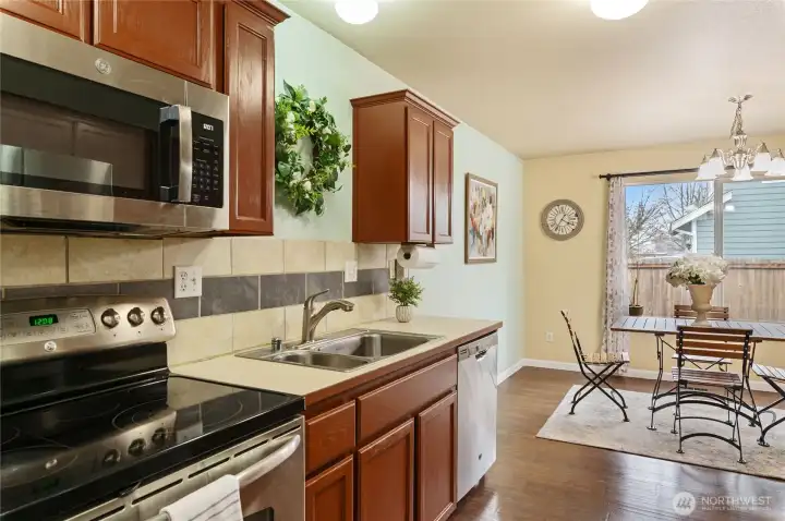 Welcome to this beautiful 4 bedroom home in the desirable neighborhood of Breckenridge. You will love the open concept living space with cozy gas fireplace and sliding glass door to backyard. The spacious kitchen has stainless steel appliances, pantry, tiled back splash & plenty of storage. Upstairs the large primary bedroom features a walk in closet and a 5 piece en suite, including double sink vanity, shower and soaking tub. The fully fenced backyard is ideally set up for BBQs, entertaining and relaxation. Conveniently located near shopping, schools, restaurants and a short commute to freeways or JBLM. One year American Shield home warranty included!