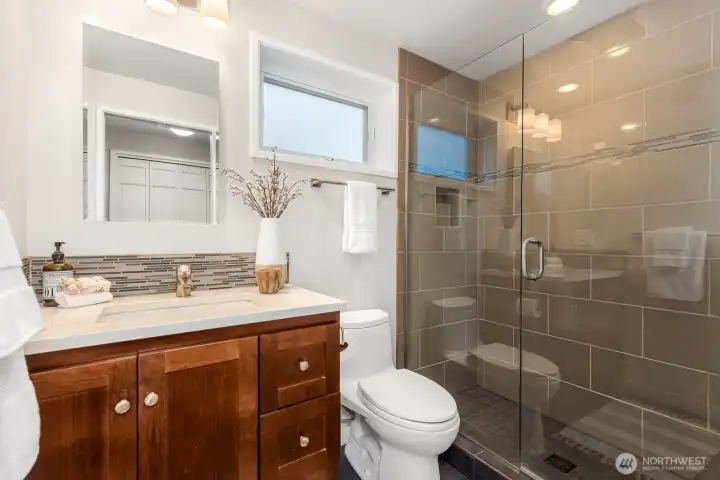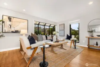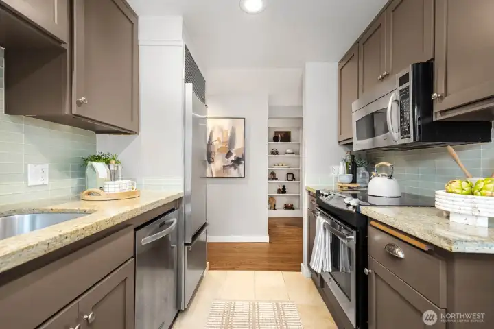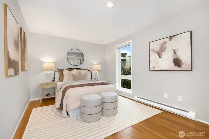 Delightful corner condo perfectly situated in the heart of Upper Queen Anne. Sun-drenched living room with expansive windows and a generous bay window frames serene greenery views. Contemporary kitchen shines with granite countertops, elegant backsplash, stainless steel appliances, highlighted by a Sub-Zero refrigerator. Rich hardwood floors flow throughout, complemented by a built-in bookcase, in-unit washer and dryer, generous closets, additional storage, and a dedicated parking spot. Open layout creates an inviting living and dining space ideal for everyday comfort and entertaining. Unbeatable walkable location to Queen Anne’s finest shops, cafes, parks, and amenities.