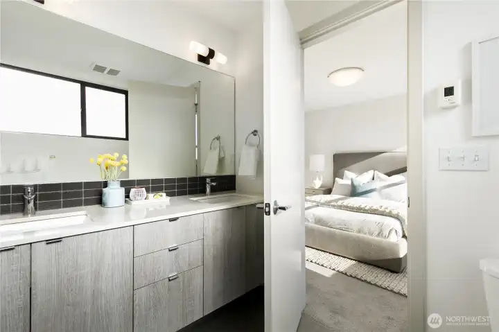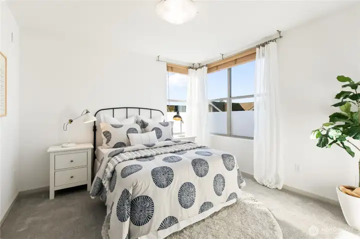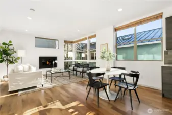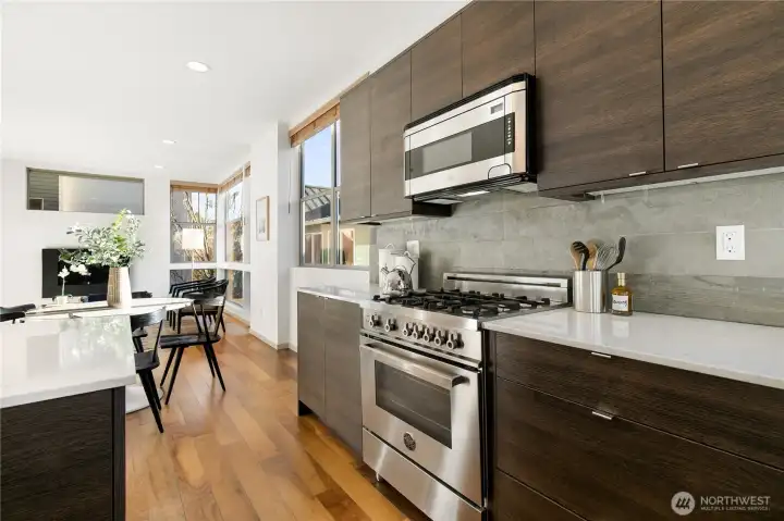 Enjoy modern living in this stand-alone townhome in the heart of Ballard. With no shared walls and no HOA, this 3-bedroom, 4-bath home offers privacy, smart design and inviting indoor-outdoor spaces. Hardwood floors and an open layout filled with natural light create a warm, ambience, while the main living area is anchored by a stylish gas fireplace—perfect for cozy days at home. The chef’s kitchen features quartz countertops, a large seating island, stainless steel appliances, and a Bertazzoni gas range, making it equally suited for daily living and entertaining. The upper level includes two spacious bedrooms, including a primary suite with Mount Rainier views and a luxe ¾ bath, plus a second bedroom, full bath and convenient laundry room. On the entry level, a flexible second living space/ rec room is joined by a guest bedroom and full bath. A sliding door opens to a private patio and grassy yard, ideal for relaxing or gardening. The expansive rooftop deck offers panoramic city and mountain views, with a wet bar just inside for easy entertaining. BuiltGreen 4-Star certified means enhanced energy efficiency, improved indoor air quality, and lower utility costs. Fresh interior paint. One designated off-street parking space. Loads of closet space for storage. Top rated schools and located just blocks from Ballard’s popular restaurants, coffee shops, boutiques, parks, and transit.