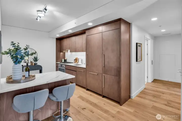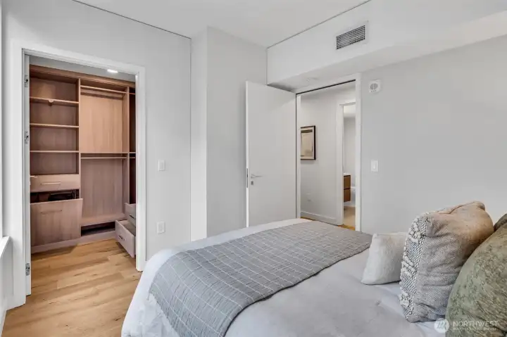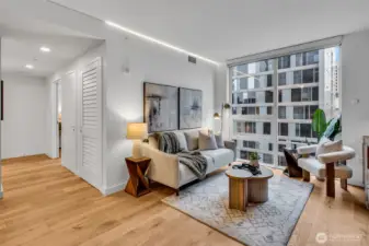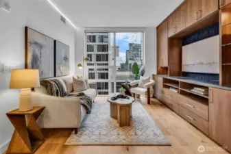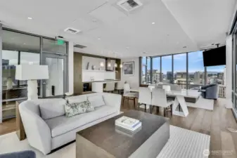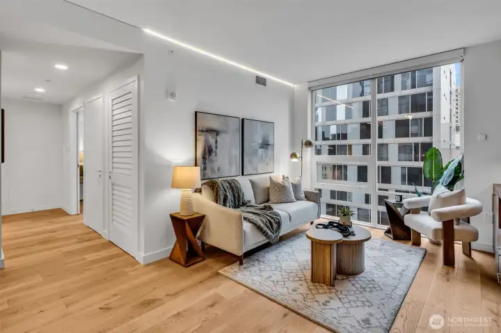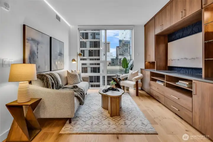 Seattle has a few true headliners, The Emerald is one of them. Rare downtown high rise home that feels thoughtfully curated, effortlessly elevated. Steps to Pike Place Market, Seattleās reimagined waterfront, wrapped in floor to ceiling glass, tons of natural light, twinkly skyline, city views, 75k in upgrades you feel the second you walk into this spacious one bed + den home. Brand new wide plank hardwoods, custom lighting, scene settings in living, den, primary, bright by day, warm, cinematic at night. Showpiece kitchen, gas cooking, Pedini cabinetry, smart pull outs, built in drawer org, high end Bosch appliances (gas), marble style quartz, custom movable island, equal parts design statement and daily workhorse. Custom built in bookcases, integrated under cabinet lighting, den/office is the real deal, true bonus room for work or creative studio. Exceptional stg, huge walk-in custom closets and built-ins, everything has a place. Spacious primary w/large CC walk in, spa like en suite (think lavish hotel level feel) Hardwired sun shades, blackout shades for real rest. Central AC, sleek LG W/D, Latch keyless entry. Residents enjoy professional 24/7 concierge, executive level fitness, yoga, pet run, pet spa, guest suite, onsite electric carshare, full floor rooftop lounge, indoor outdoor spaces, panoramic views of the Sound, Mt. Rainier, Olympics and unreal Seattle skyline. Over 75k in handsome interior upgrades. Living at The Emerald in the Emerald City just hits different.