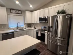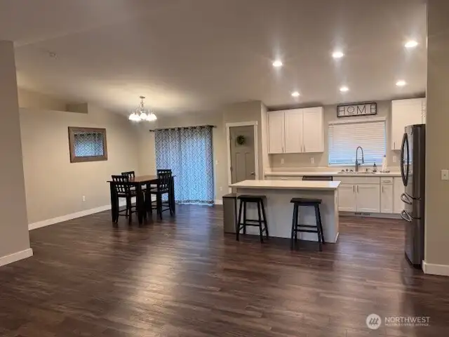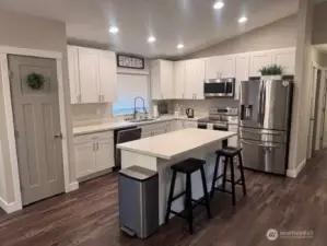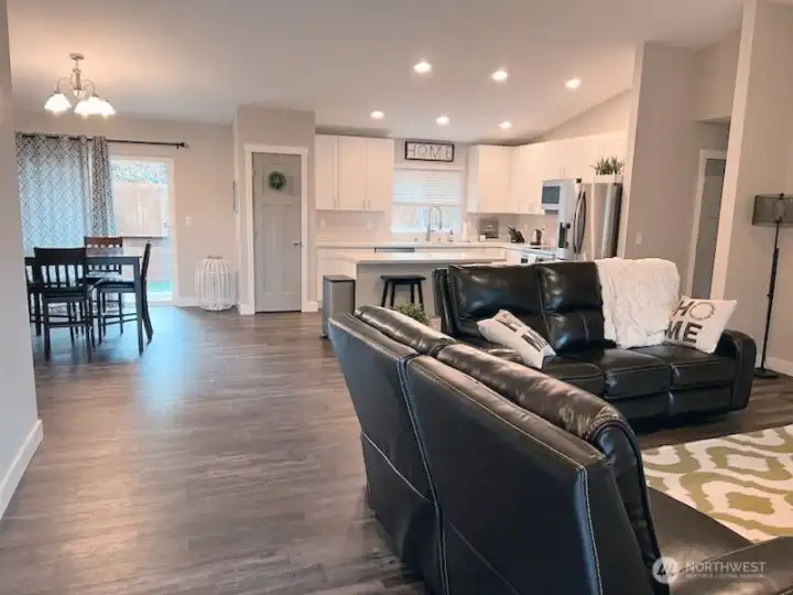 Charming rambler with living room that overlooks the front of the property. Home has beautiful vinyl plank floors throughout with bright natural light. Wonderful open floor plan with gourmet kitchen that includes a large island, quartz counters, stainless steel appliances, and tile backsplash. Beautiful spacious primary bedroom w/private 5-piece bath on one side of the house w/two additional bedrooms & full bath on the opposite side. Large two car garage that offers potential to be converted into additional living space. Home has AC! Home is close to a public access lake and a private lake (membership $75 annually, buyer to verify).