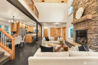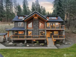 Privately tucked on 2.9 serene acres, this new construction 5 bed, 5 bath home + 1 bed, 1 bath ADU features custom finishes throughout. Main floor offers open-concept living, custom stone fireplace, and chef’s kitchen w/ knotty alder cabinetry and Forno appliances: 60” dual fridge, 48” 8-burner gas range w/ dual convection + rotisserie, microwave, 2 dishwashers, and 2 sinks. Main level includes bed, office, full bath, laundry. Upstairs: primary w/ balcony + spa bath, plus 2 beds + full bath. Lower-level suite w/ living, dining, kitchenette w/ bar, ensuite bath w/ 72” tub + guest bath. 3-bay garage + ADU + generous off-street parking and RV space. 400-amp service, multiple HVAC, mini split.