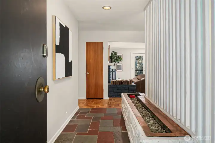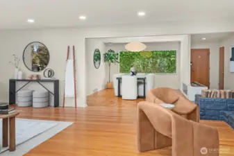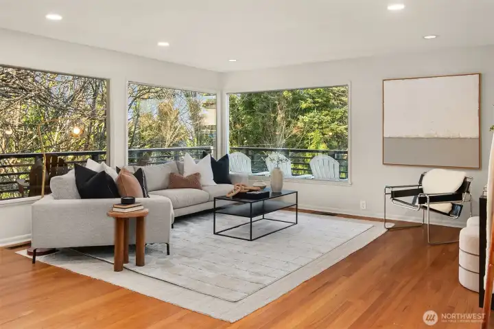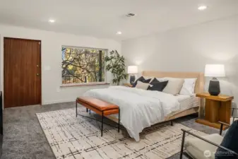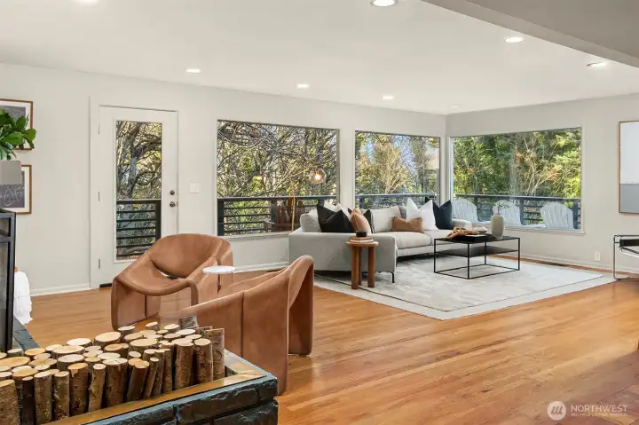 Tucked at the end of a peaceful dead-end street in coveted North Beach, this spacious 5 bedroom 2.5 bathroom captivating midcentury home feels like a private sanctuary in the city. Surrounded by trees and backing to a beautiful greenbelt, it's the private deck and large patio with pergola are a retreat where birdsong greets you each morning. Inside, nearly 3,840 sq ft a warm, welcoming and updated space unfolds - complete with original Herman Miller lighting, oak hardwood floors, tile floors, large picture windows, a gourmet granite kitchen with stainless steel appliances and granite countertops, new carpet, new interior paint and a dreamy top-floor primary suite with Puget Sound views. Thoughtful updates include a new roof, whole-house AC, earthquake retrofitting, and even a secret custom home theater by Definitive Audio. A rare blend of character, comfort, and quiet in the desirable North Beach community. This one’s a true gem.