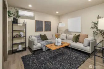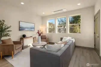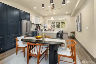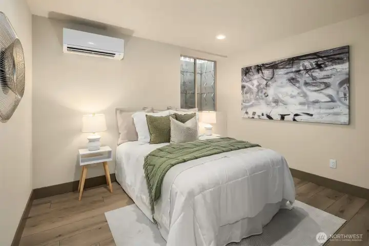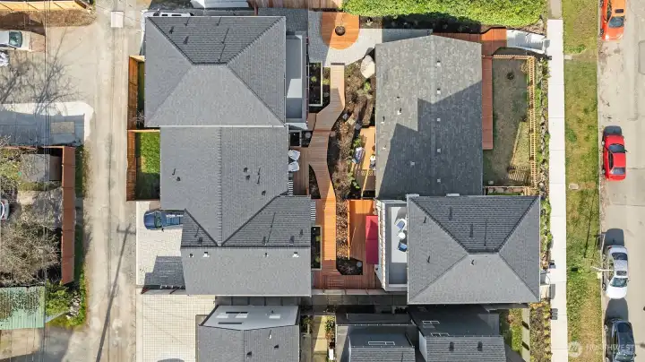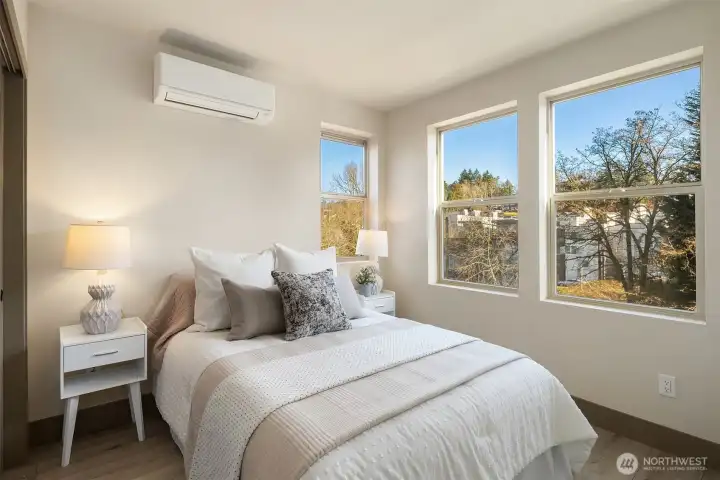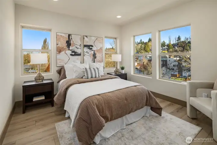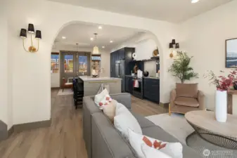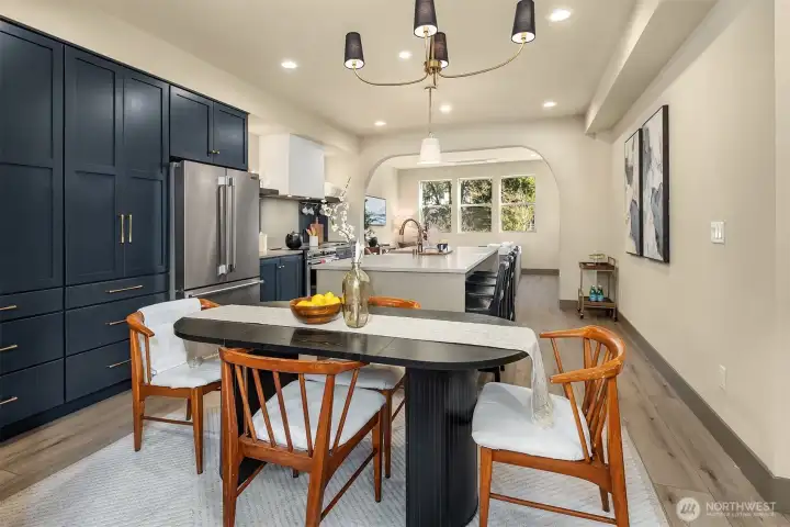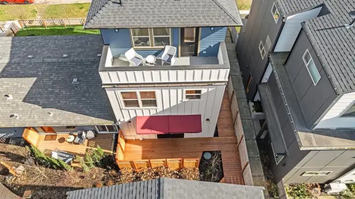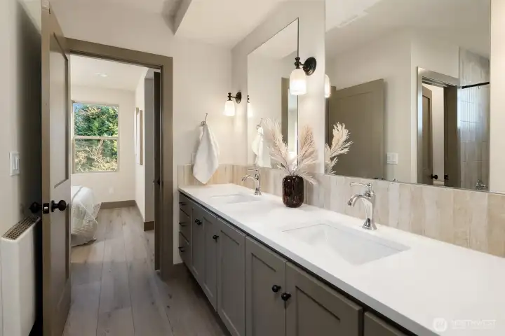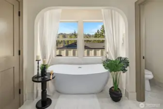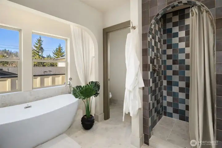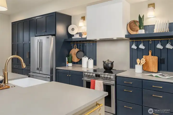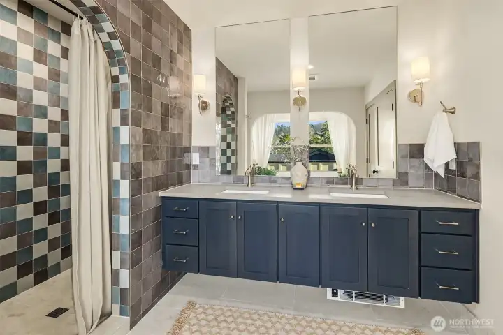 Designed for gathering and living beautifully, this Garden Terrace home unfolds into generous, light-filled spaces. The kitchen channels European countryside charm with navy alderwood cabinetry, brass rails imported from London, and classic fireclay apron sinks with timeless character. A cozy TV room offers the perfect setting for relaxed evenings, while a thoughtfully designed guest suite provides comfort and privacy for visitors. Upstairs, the primary suite feels like a private retreat, featuring a striking freestanding 70-inch soaking tub surrounded by floor-to-ceiling tile and brass accents for a spa-inspired experience. Cedar decks, hand-painted motifs, and curated lighting complete a setting where memories naturally take shape.
