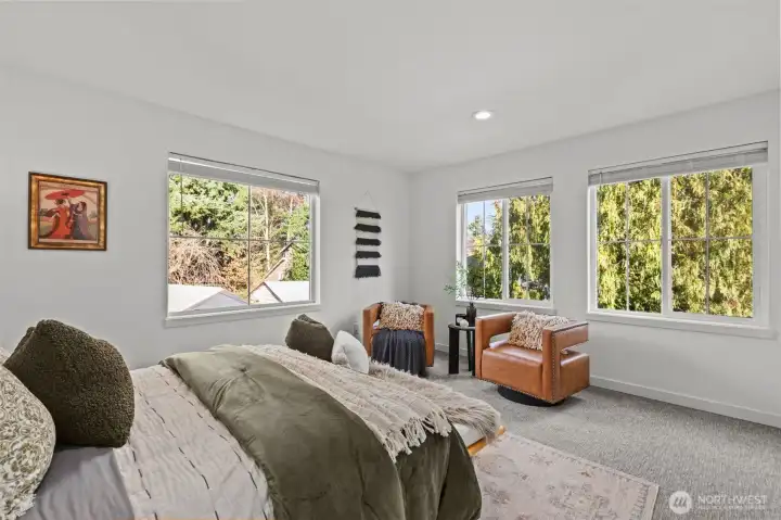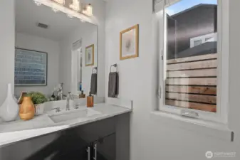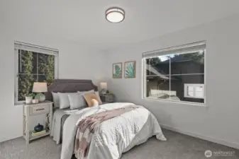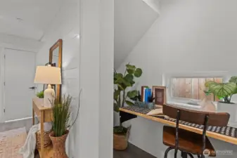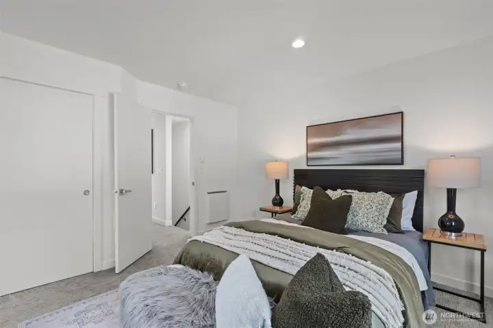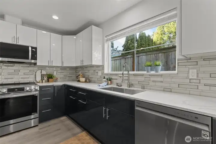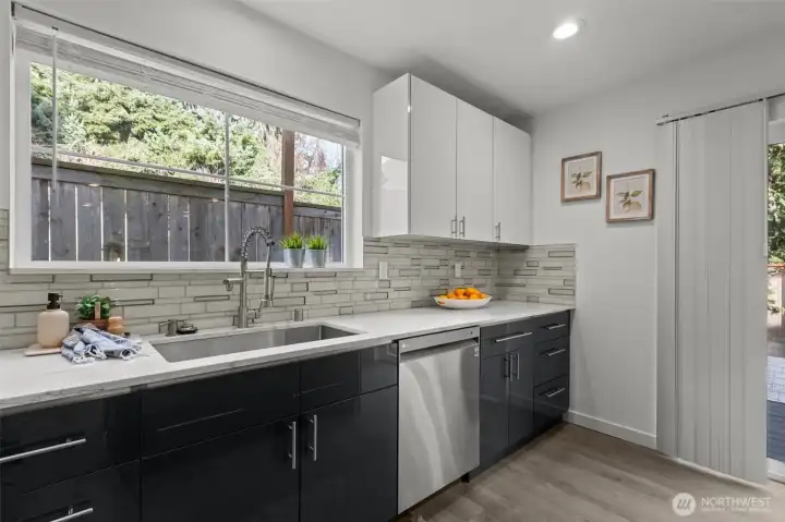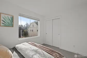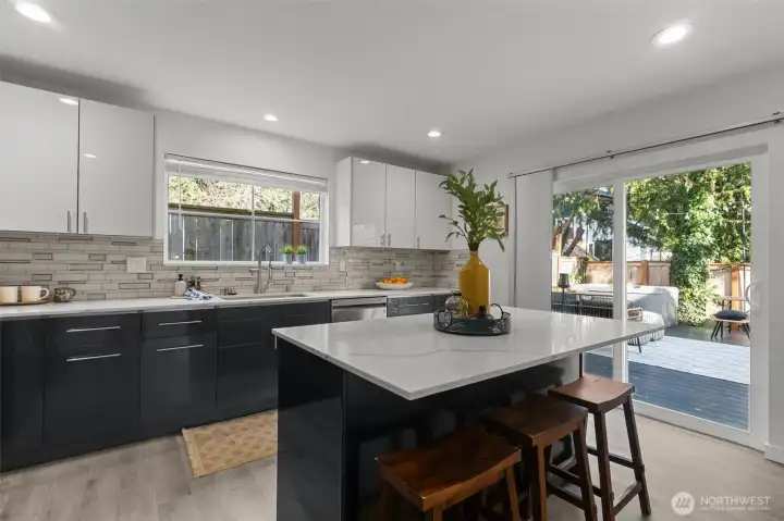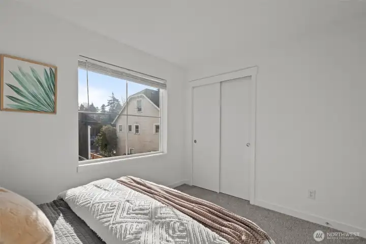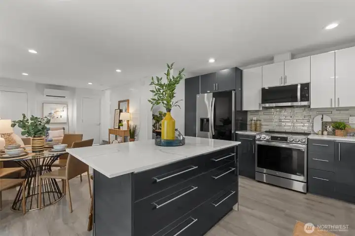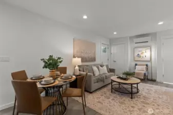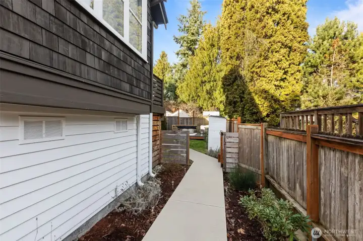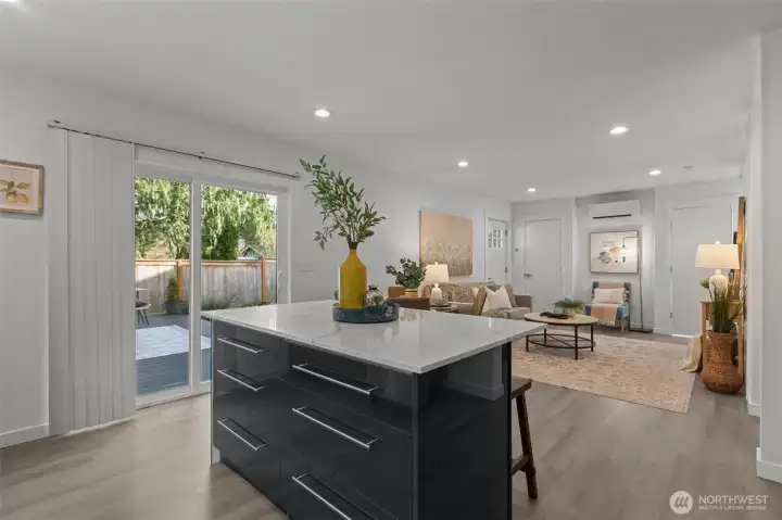 Impeccably maintained, move-in-ready standalone home built in 2023, tucked away on a quiet residential street. This light-filled two-story home lives larger than its square footage and offers privacy with a fully fenced yard. Open main floor features a stylish kitchen with quartz countertops and stainless steel appliances, plus an office nook, large laundry closet, and ample storage. Sliding doors extend living space to a private front patio deck, ideal for relaxing or entertaining. Dedicated off-street 2+ car parking pad. Mini-split heating and A/C for year-round comfort. Convenient access to groceries, dining, transit, downtown Seattle, and I-5.
