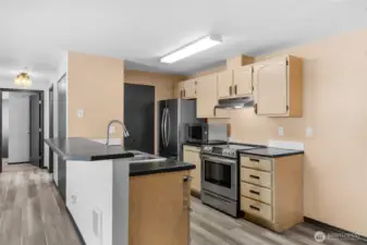 BACK ON MARKET DUE TO BUYERS FINANCING FALLING THROUGH - Discover easy top-floor living in this 2-bedroom, 1.75-bath condo located within a secure, gated community. Offering 907 sq ft of open-concept living space with newer floors, carpet, appliances and interior paint, this home is move-in ready and awaiting your personal touch. The inviting living area features a cozy gas fireplace and opens to a private balcony, flowing seamlessly into the dining space—perfect for both entertaining and everyday living. Enjoy a highly convenient location close to shopping, dining, schools, Boeing, I-5, and a nearby golf course. The well-maintained community reflects pride of ownership and a peaceful atmosphere. HOA dues cover water, sewer, garbage, and common area maintenance. Located in the desirable Mukilteo School District. Excellent investment opportunity with no rental cap. Condo comes with 2 parking spaces- C15 (carport) & 175.