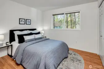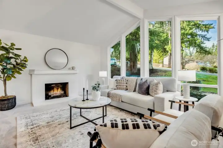 Located in the highly sought after Kirkland Highlands, this beautifully maintained four bedroom, two and a half bath home offers a bright, airy floorplan and thoughtful modern updates throughout. The light filled interior showcases newly finished and stained hardwood floors, new carpet, and fresh interior paint, creating a clean, cohesive feel. Vaulted ceilings and expansive windows fill the main living spaces with natural light, while a cozy gas fireplace adds warmth and architectural interest. The kitchen opens effortlessly to the primary living areas, offering sleek modern finishes and an open, functional layout well suited for both everyday living and entertaining. An oversized brand new Trex deck extends the living space outdoors, overlooking a flat, private backyard that offers a quiet and serene setting. Mature trees provide a natural sense of privacy while maintaining excellent light throughout the home. The lower level offers flexible living with a spacious family room, utility room, and direct access to the oversized garage. Upstairs, four well proportioned bedrooms include a serene primary retreat with en-suite and three additional bedrooms. Located just minutes from I405, downtown Kirkland, parks, dining, and shopping, and within the highly coveted Lake Washington school district.