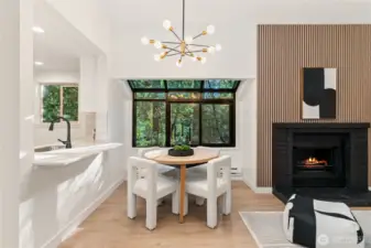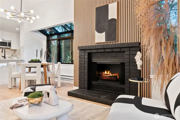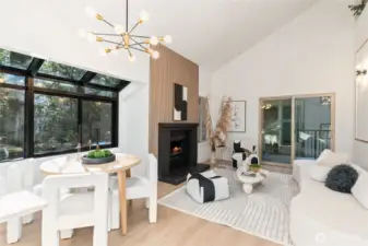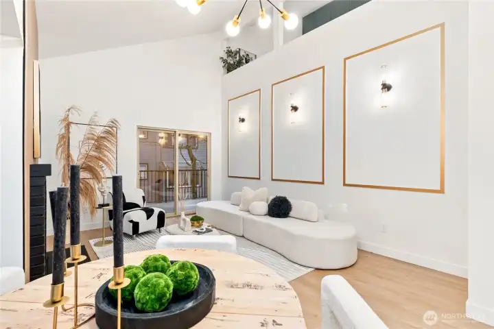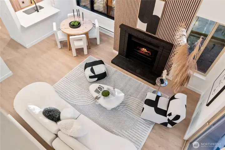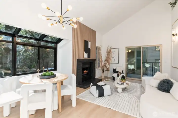 One of the finest condos in the community, this absolutely turn-key residence is a must-see. Soaring vaulted ceilings and abundant natural light create an airy, sophisticated atmosphere throughout. The home has been thoughtfully updated with new custom cabinetry, luxury LVP flooring, stainless steel appliances, and a timeless real-wood fireplace that anchors the living space with warmth and charm. The dream kitchen flows seamlessly into the living room, which opens to a covered balcony—perfect for relaxing or entertaining year-round.The main floor features a stunning bedroom and a fully updated guest bathroom, offering flexibility and convenience. Upstairs, the loft-style primary suite showcases vaulted ceilings, brand-new carpet, generous closet space, and an additional oversized storage area rarely found in condo living. A brand-new water heater adds peace of mind.This home includes one covered carport with electrical hookup, ample additional parking, and access to EV charging stations. The well-managed HOA boasts high owner occupancy and strong reserves. Ideally located just minutes from the Microsoft campus via light rail, with easy access to I-405, shopping, Costco, and dining—this is effortless, elevated living at its best. Won't last Long! Absolutely MUST SEE!