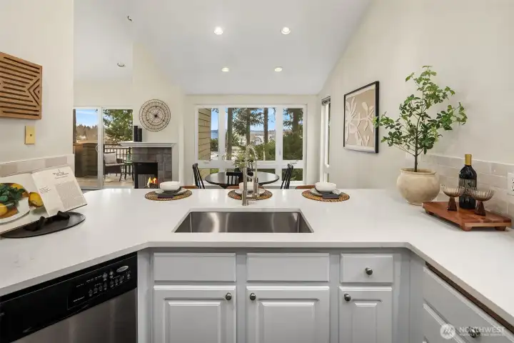 Top-floor corner Kirkland condo in the heart of Juanita featuring shimmering Lake Washington views, vaulted ceilings, and a private home office loft. This light-filled residence offers a spacious open-concept kitchen and dining area that flows into a grand living room with soaring vaulted ceilings. Enjoy the breathtaking Pacific Northwest backdrop of the Seattle skyline and Olympic Mountains from your large private balcony. The versatile floor plan includes 2 bedrooms and 1.75 baths, plus a rare bonus loft perfect for a home office or creative retreat. Enjoy tasteful updates to both kitchen and bathrooms, in-unit washer/dryer, ample storage, 2 parking spaces, and the quiet living of a gated community. Experience an incredible lifestyle with a high walk score: you are mere blocks to Juanita Beach Park, waterfront trails, and local restaurants. With easy commuter access to 405 and under 12 min to Google Kirkland, this is the ultimate Eastside retreat. Juanita Kirkland living at its finest.