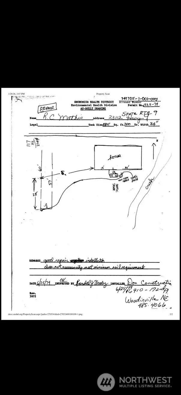 A river does run through it... Let's go back to the year 1927 almost 100 years ago when this house was built. Woodinville was barely reaching its mid to late 30s. Well, the foundation is strong the walls have Fallen a victim of time and Mother nature, and is ready to be restored to its Past glory. Yes, it has a bridge, yes, it has out buildings. Yes, it is close to over 100 wine tasting rooms. Yes, it is 5 acres... and Yes, it needs some TLC. It is ready for someone with a vivid imagination and a 19th century work habit! Only the brave of heart will be ready to take on this project. Please do all your research of access, water, sewer, and power for a home that was lived in for decades.