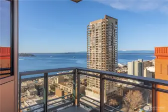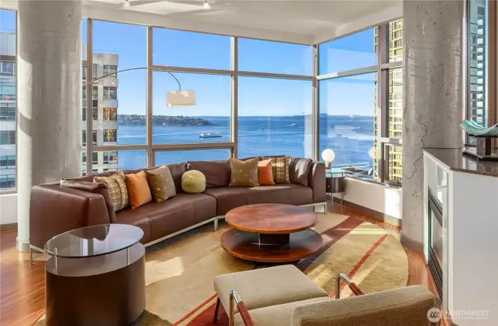 Sitting high above the city, enjoy snowcapped Olympic Mountains with Puget Sound as a foreground with ferries skimming across the water, cruise ships in port, and the brilliant Seattle Great Wheel. This Vibrant NW corner will delight with floor to ceiling windows to allow the sun to shine in. Large view deck off the living area to enjoy the fresh breeze. Custom Den area blends in perfectly in the living area. Stunning master bedroom with soaking tub will not disappoint. Second bedroom with sweeping views as well. Two parking spaces - EV ready, with a storage unit conveniently next to them. Cristalla amenities: rooftop deck w/BBQ, private seating areas, dog area, full gym, hot tub, sauna, steam room, lounges, business center, & 24/7 concierge service. All this above the city with a full range of lifestyle with the waterfront, Pike Place Market, the Amazon Spheres, shops, and world class restaurants to enjoy.